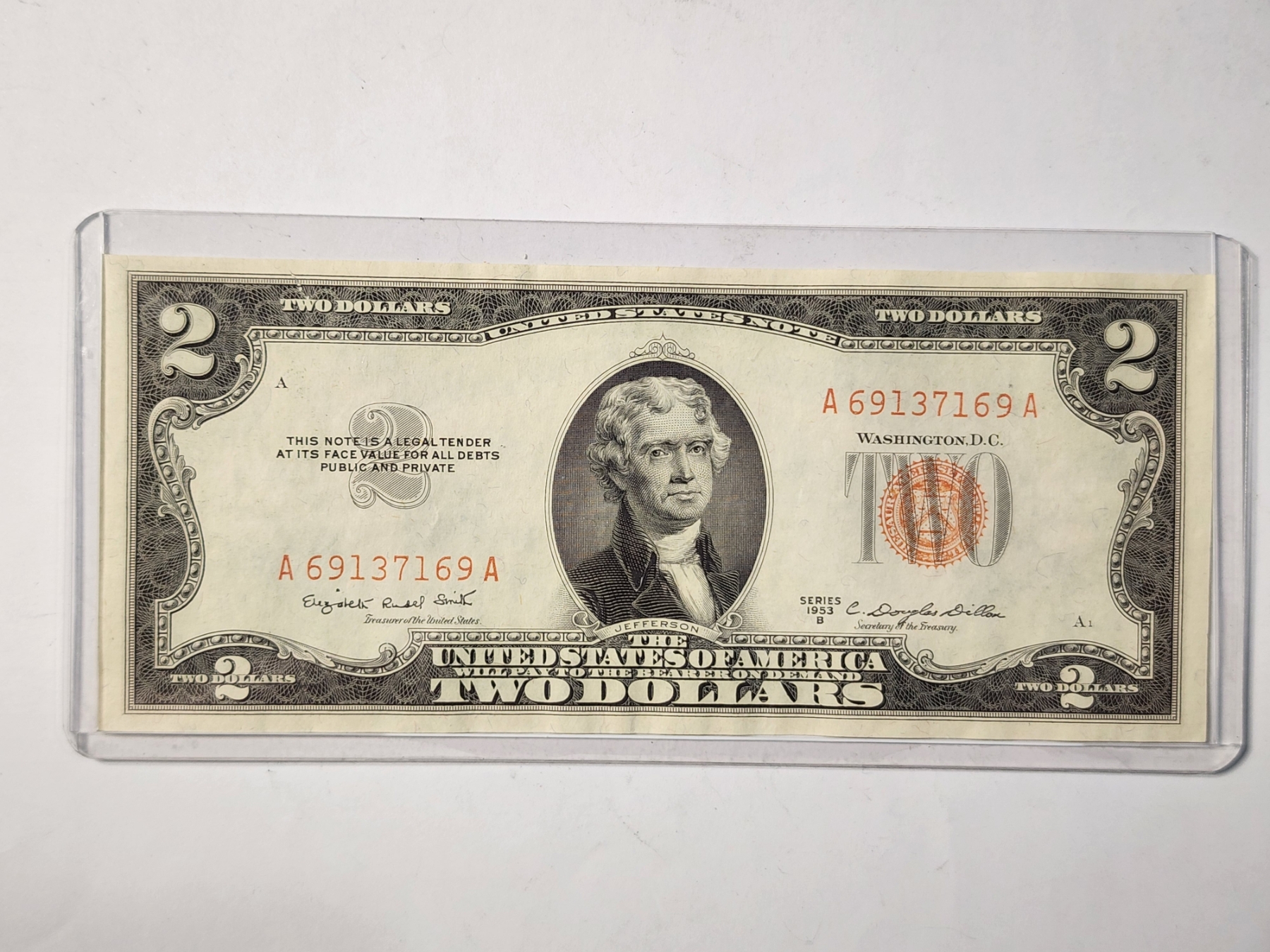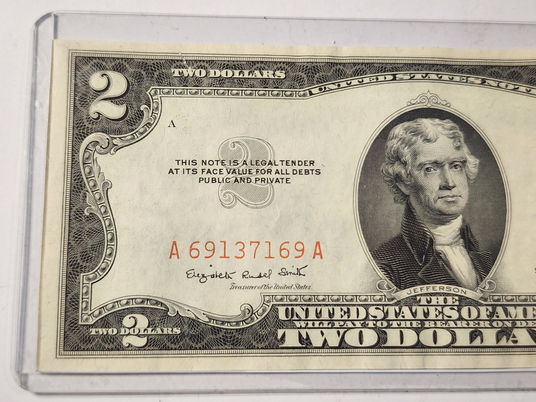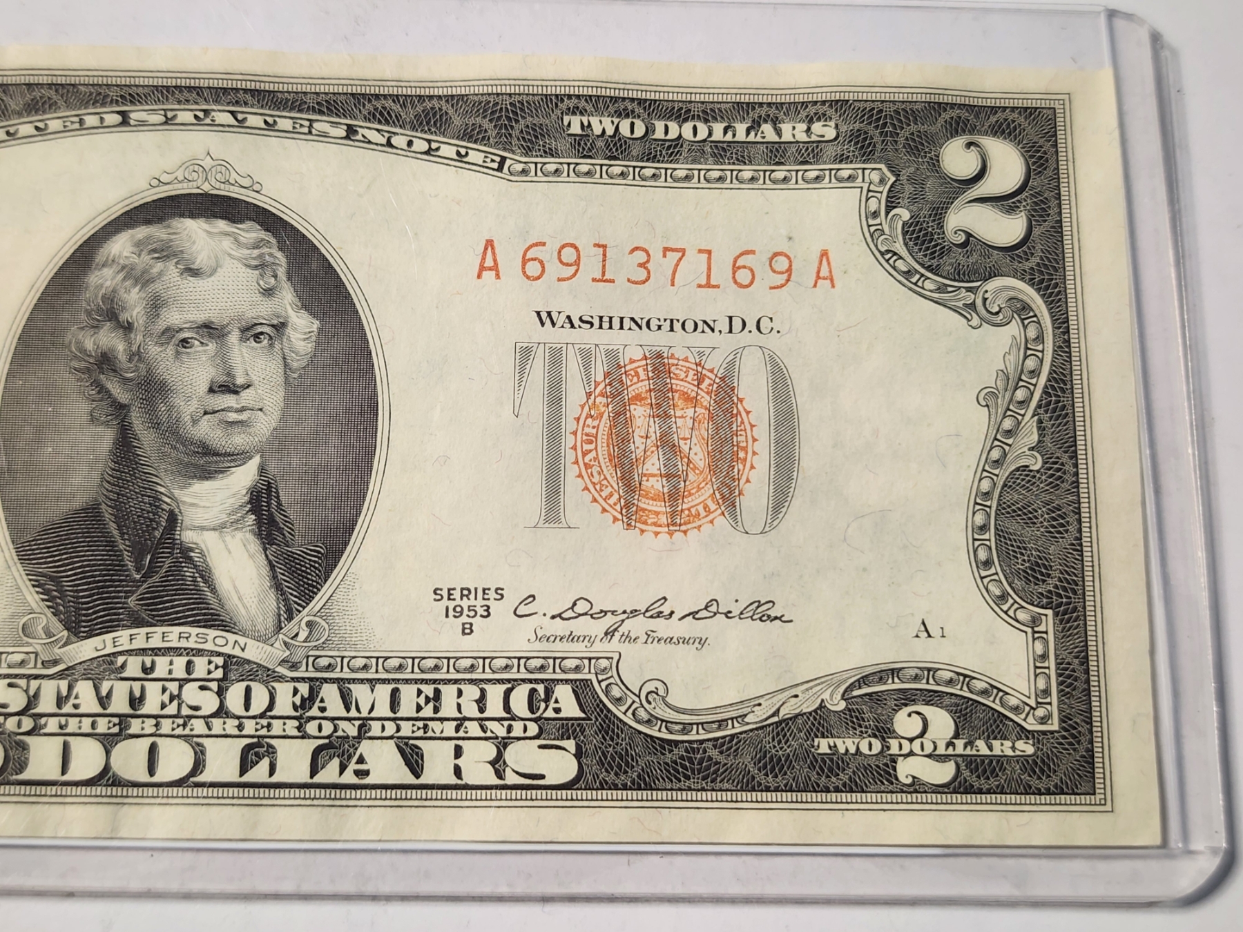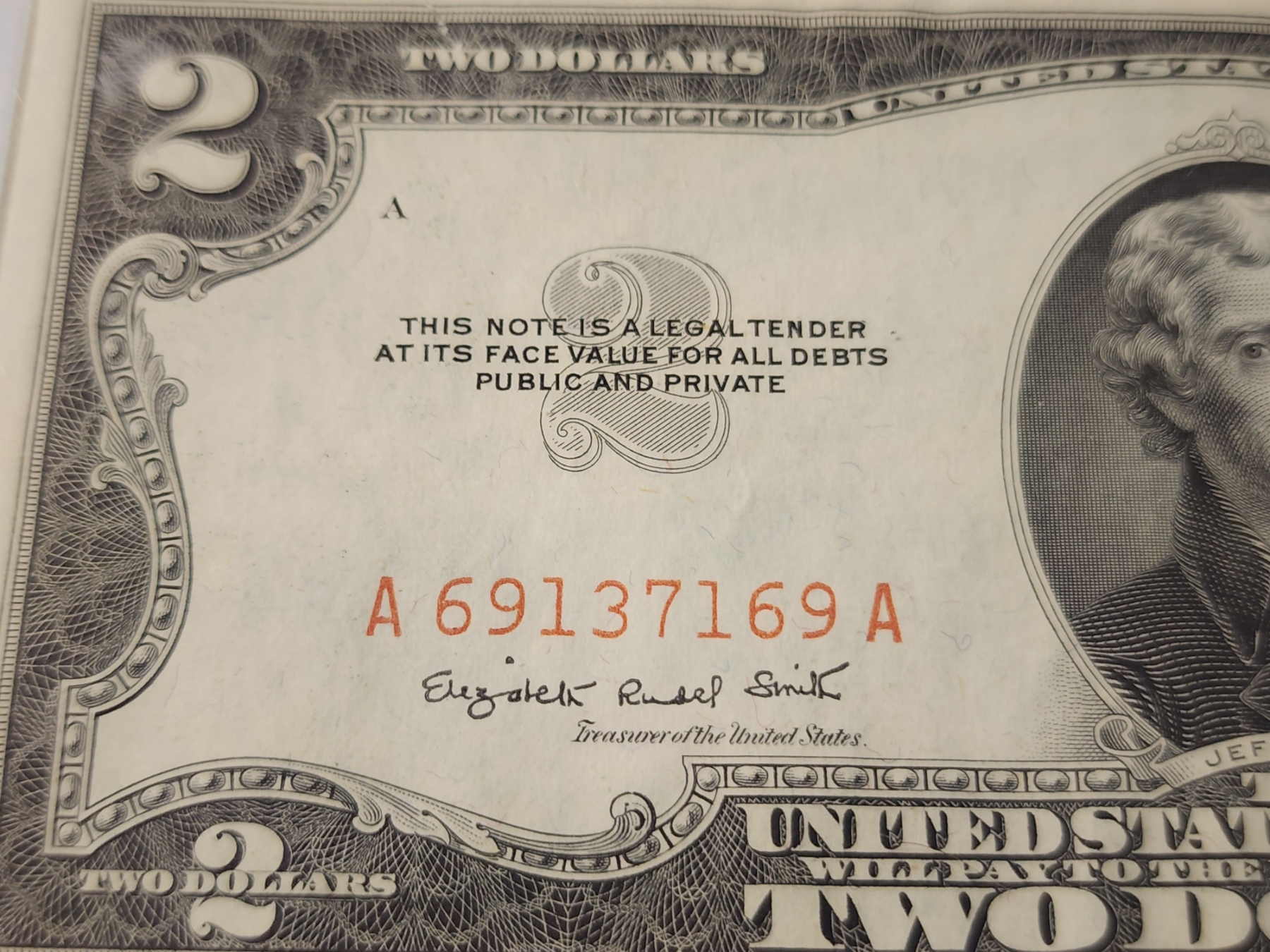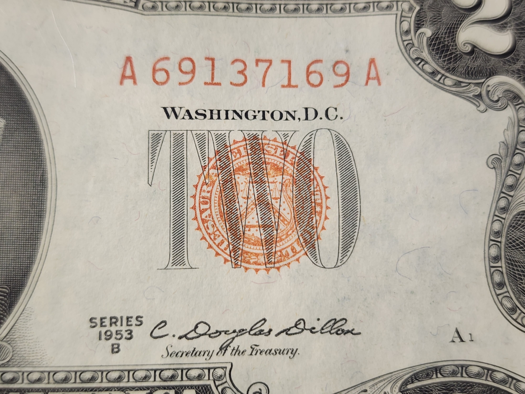EXTREMELY RARE DYE CONTAMINATION NOTE ~ $2 Red Seal Federal Reserve Note With Dye Contamination Error Causing the Serial & Seal Appear An Orange Color Rather instead of the Red Color it should be. This is a Rare Error with these 1953 Notes & add value to the collectability of it! This specific piece is in higher grade condition!