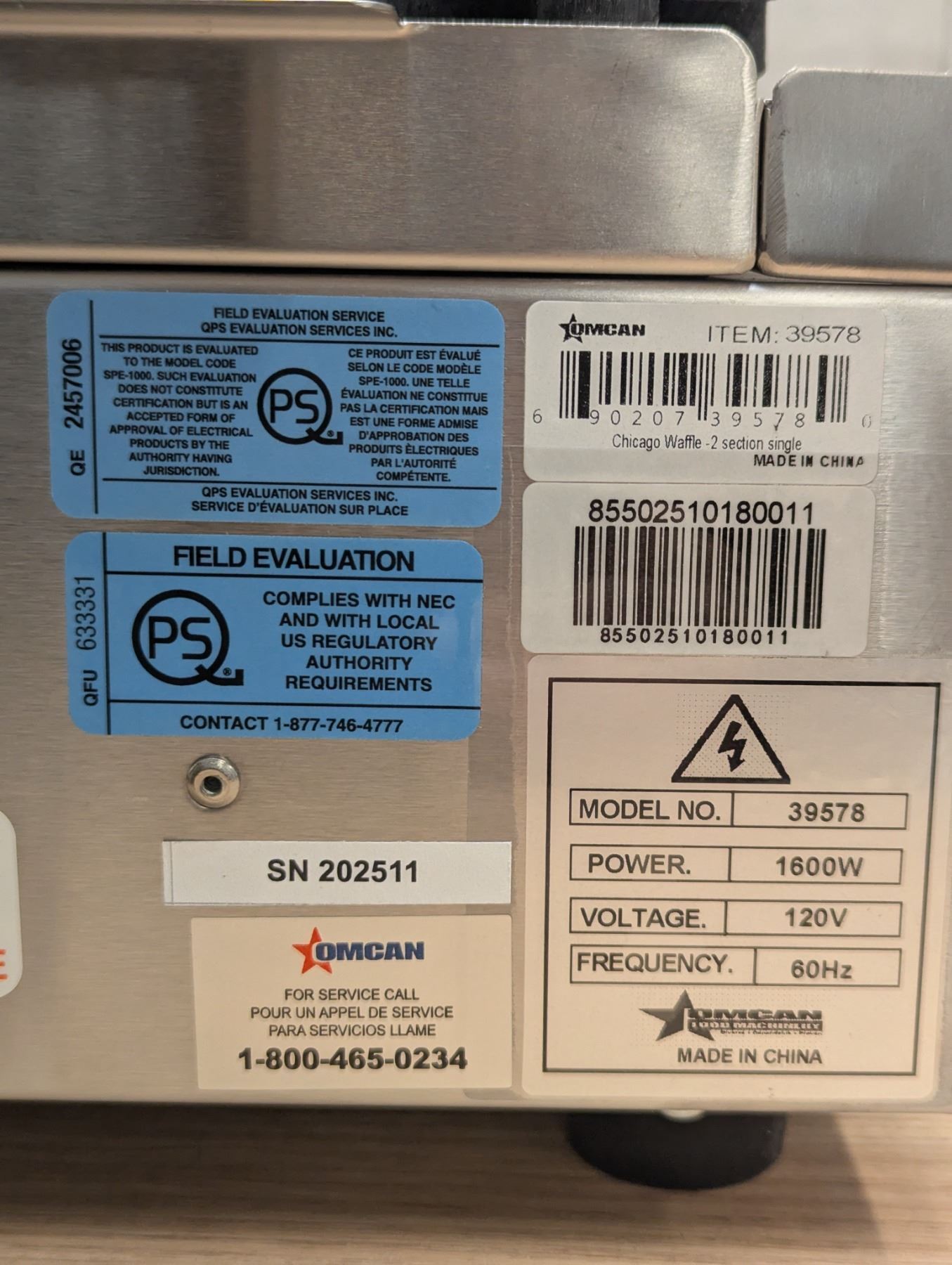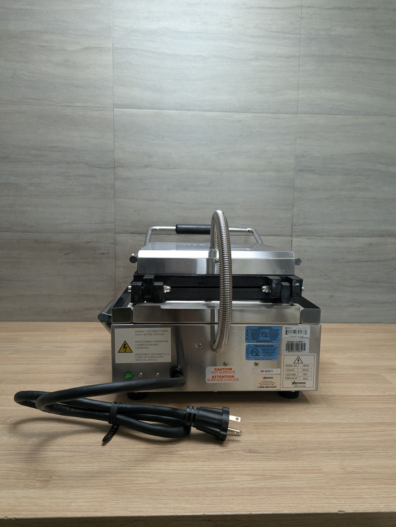 [New in Box,] Electrical: 110V/60Hz/1Ph, Power: 1200W, cast iron grids, built-in timer