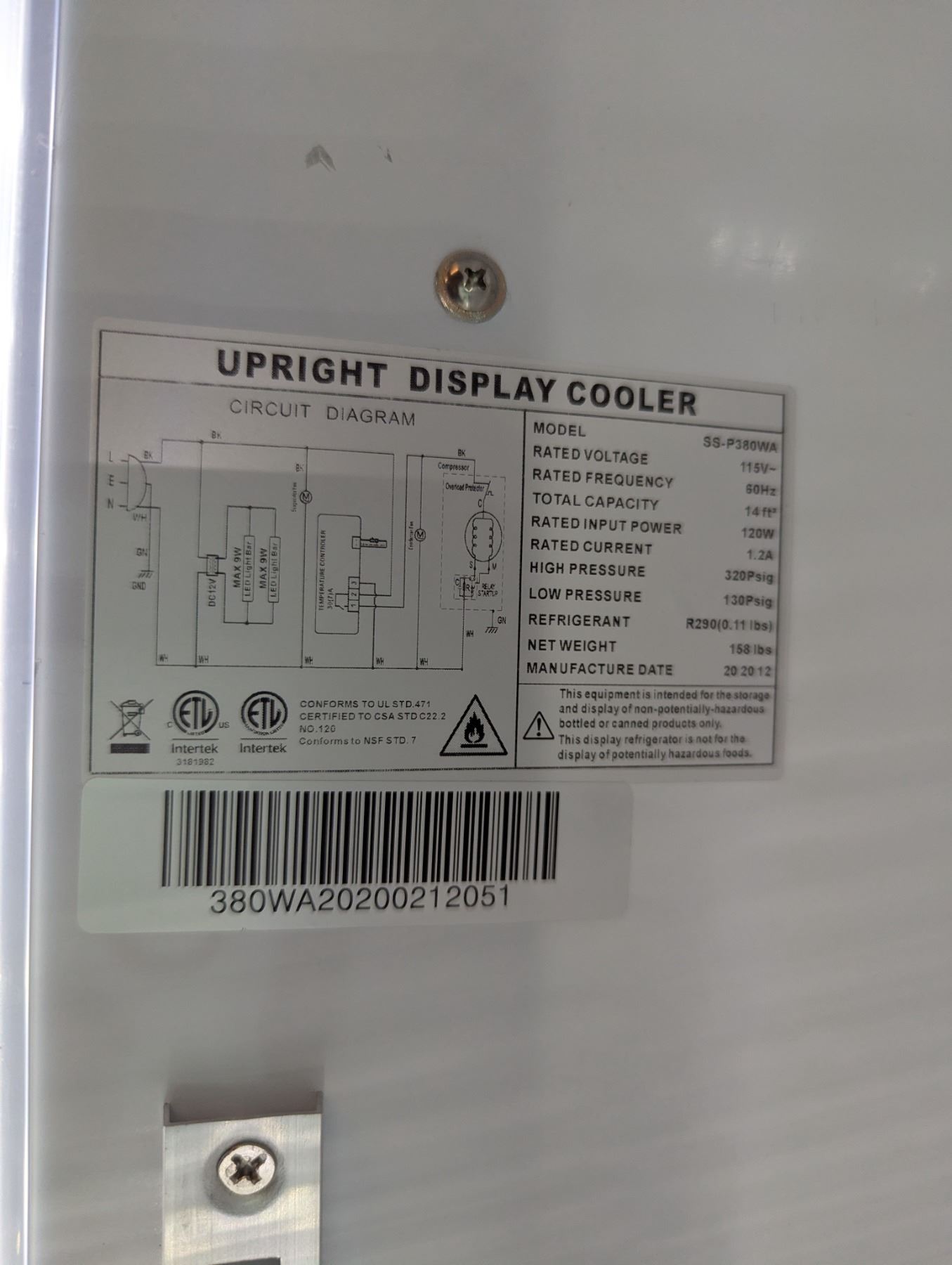 [Used, Tested/Working,] Serial# 380WA20200212051, Model: SS-P380WA, 24" x 23" x 77", 115V/60Hz/1Ph
