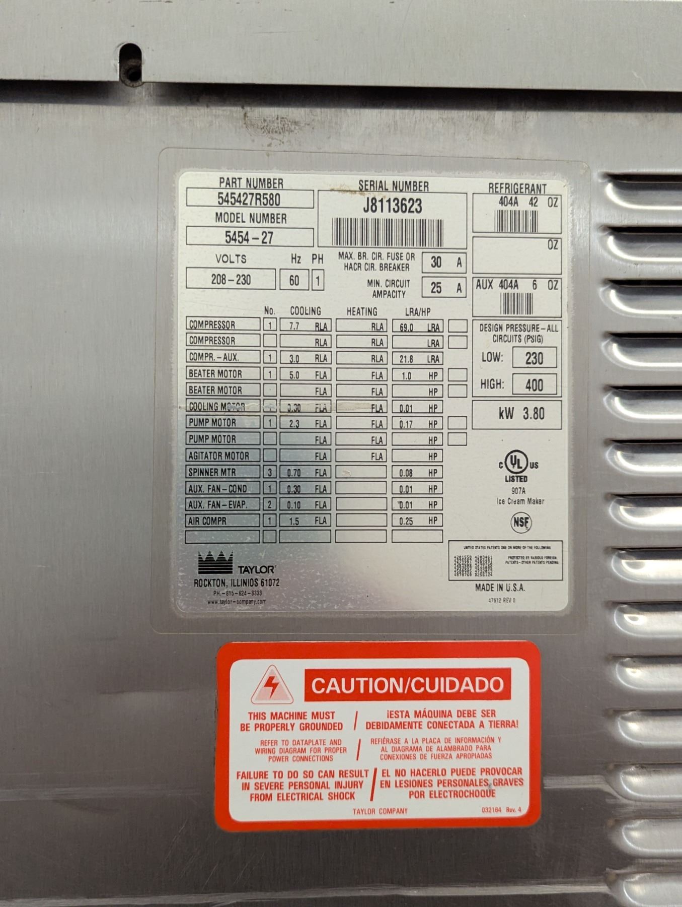 [Used, Tested/Working, Dents,] Serial# J8113623, 21" x 36" x 68-14", 208-230V/60Hz/1Ph