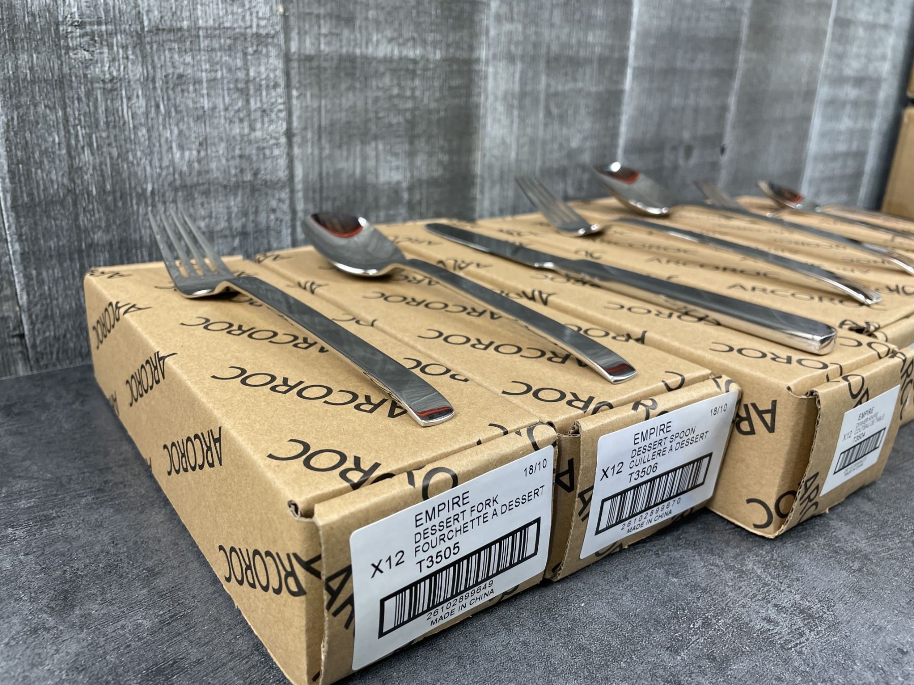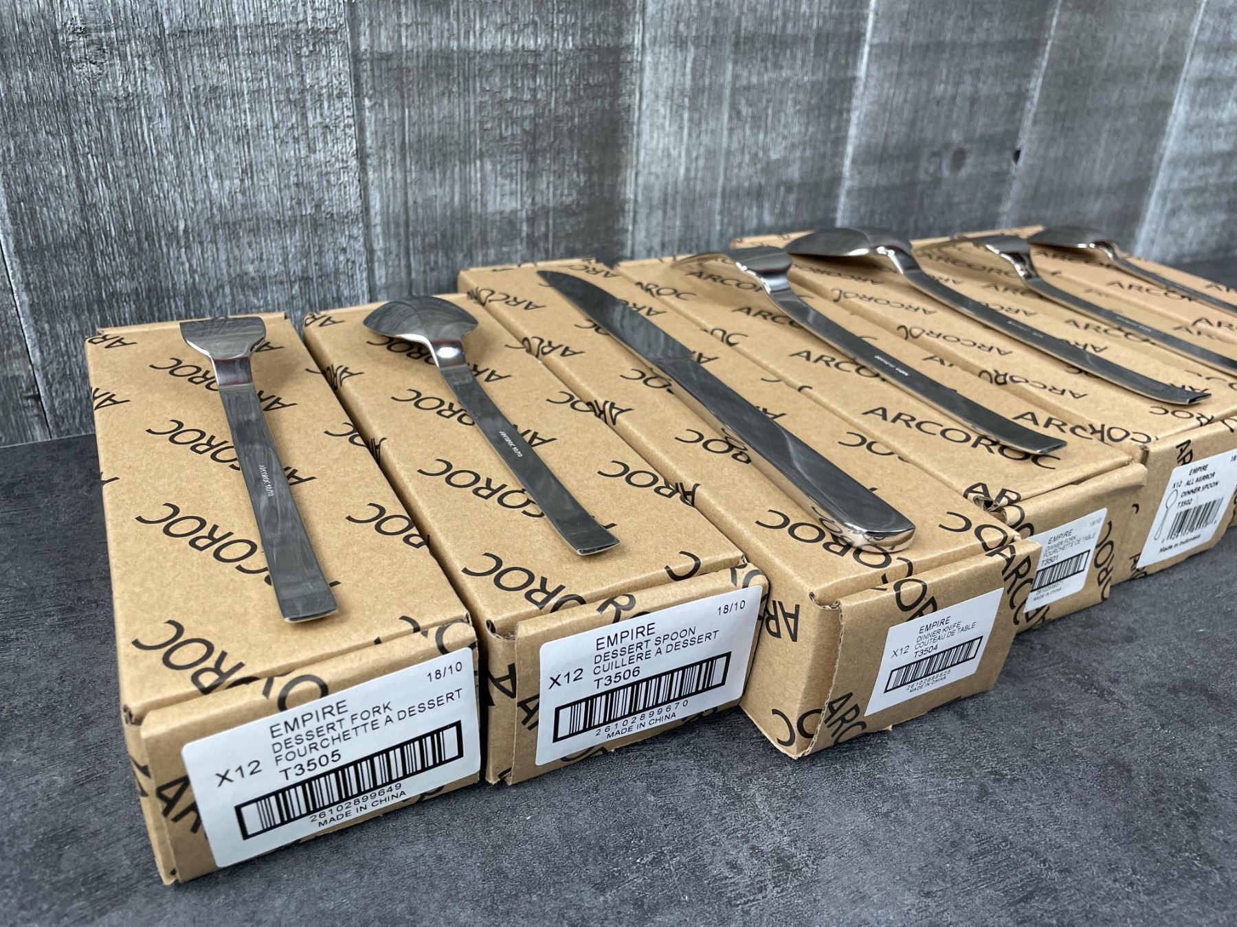 [New In Boxes,] 18/10 Stainless - $445 Retail Value! 12 Each (1 Box) of: Dinner Forks T3501, Dinner Spoons T3502, Dinner Knives T3504, Dessert Forks T3505, Dessert Spoons T3506, US Teaspoons T3528, Salad Forks T3529