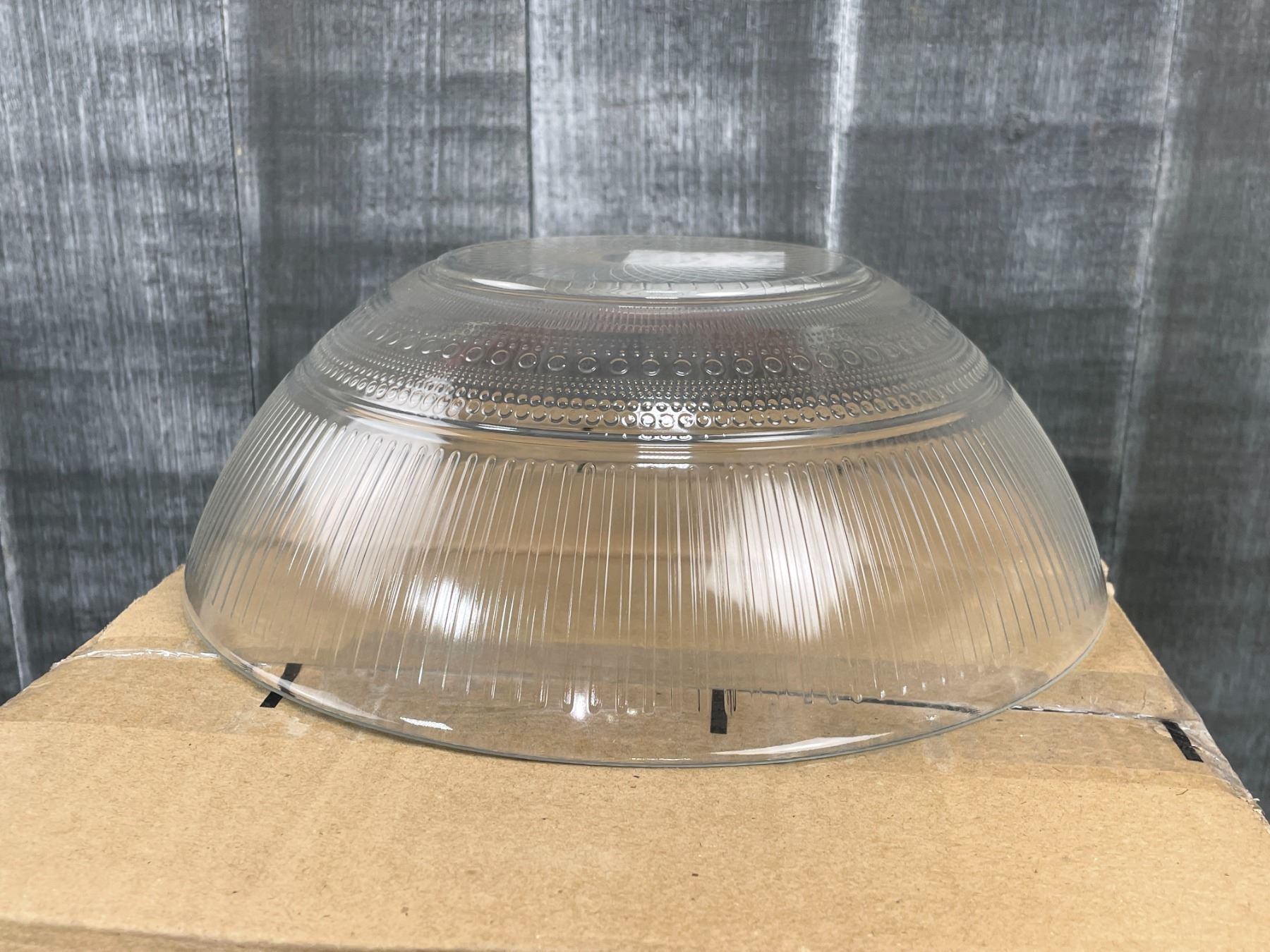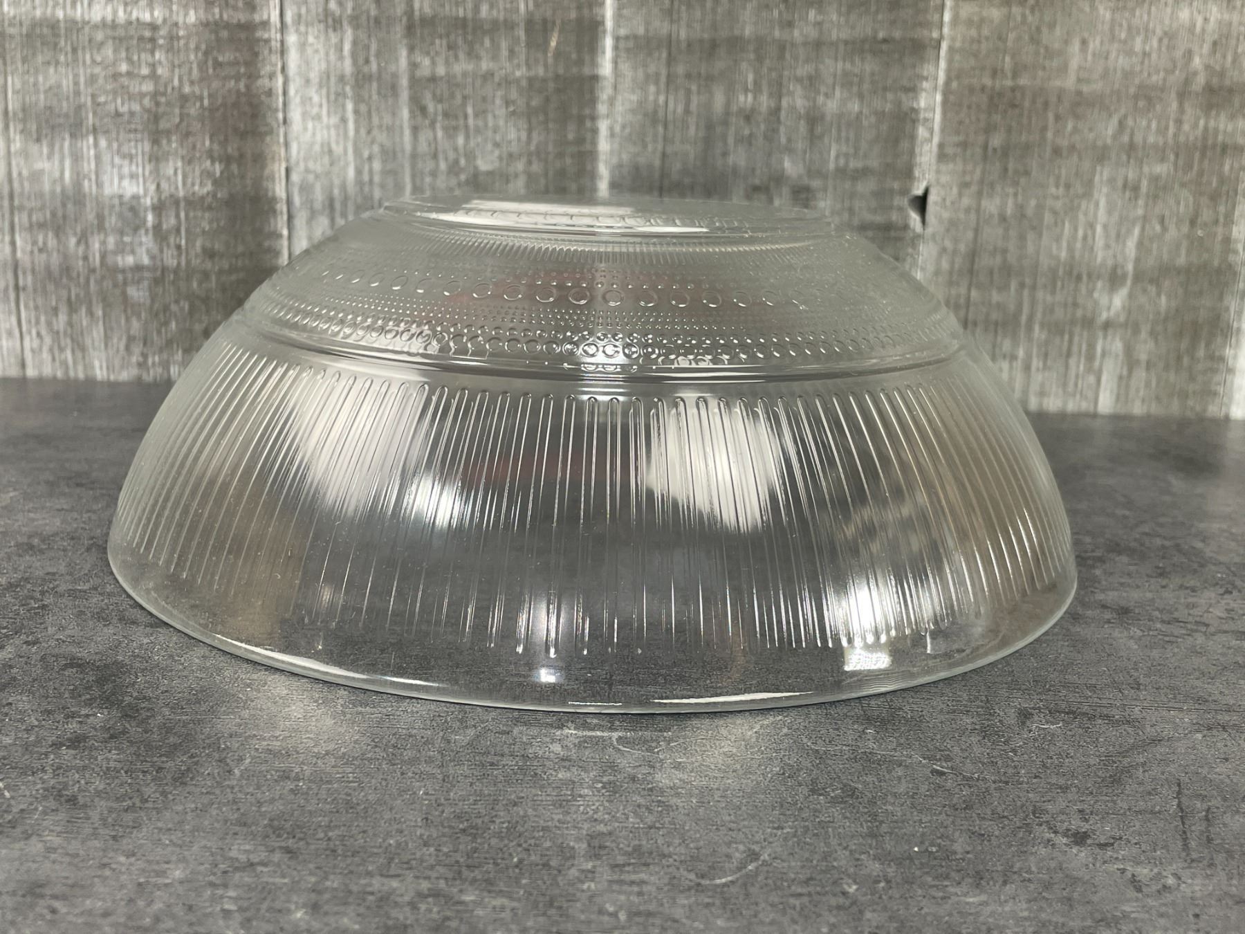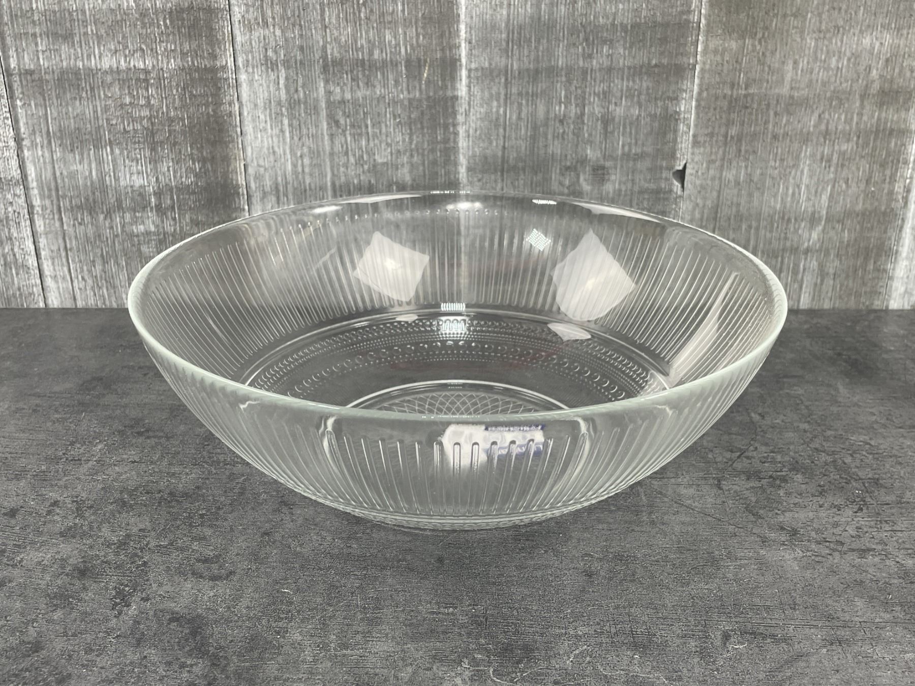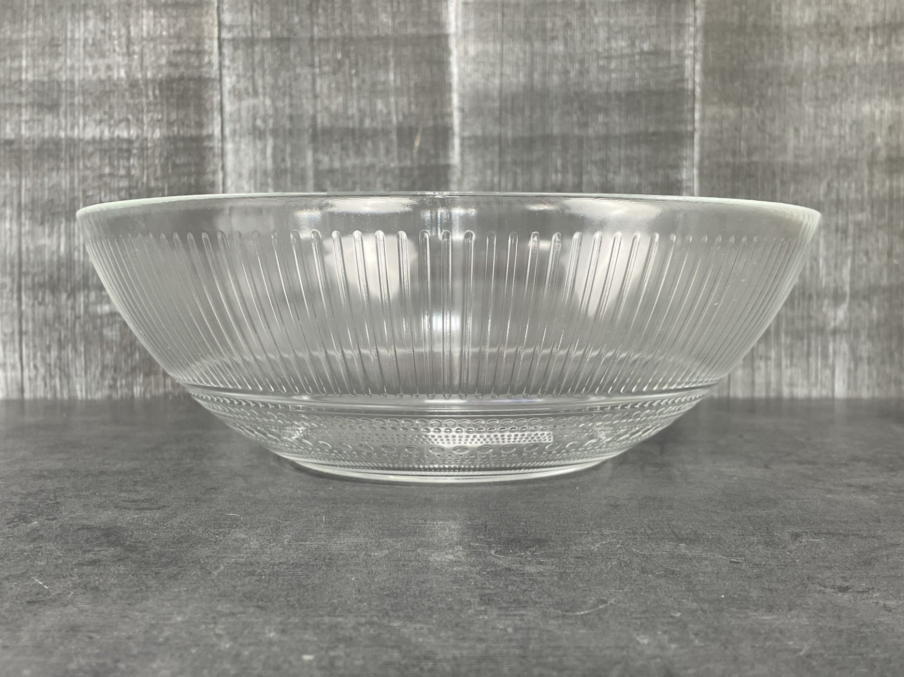 [New In Boxes,] Made In France, Fully tempered clear glass, patterned with lines and beaded textures. 10.25" Diameter