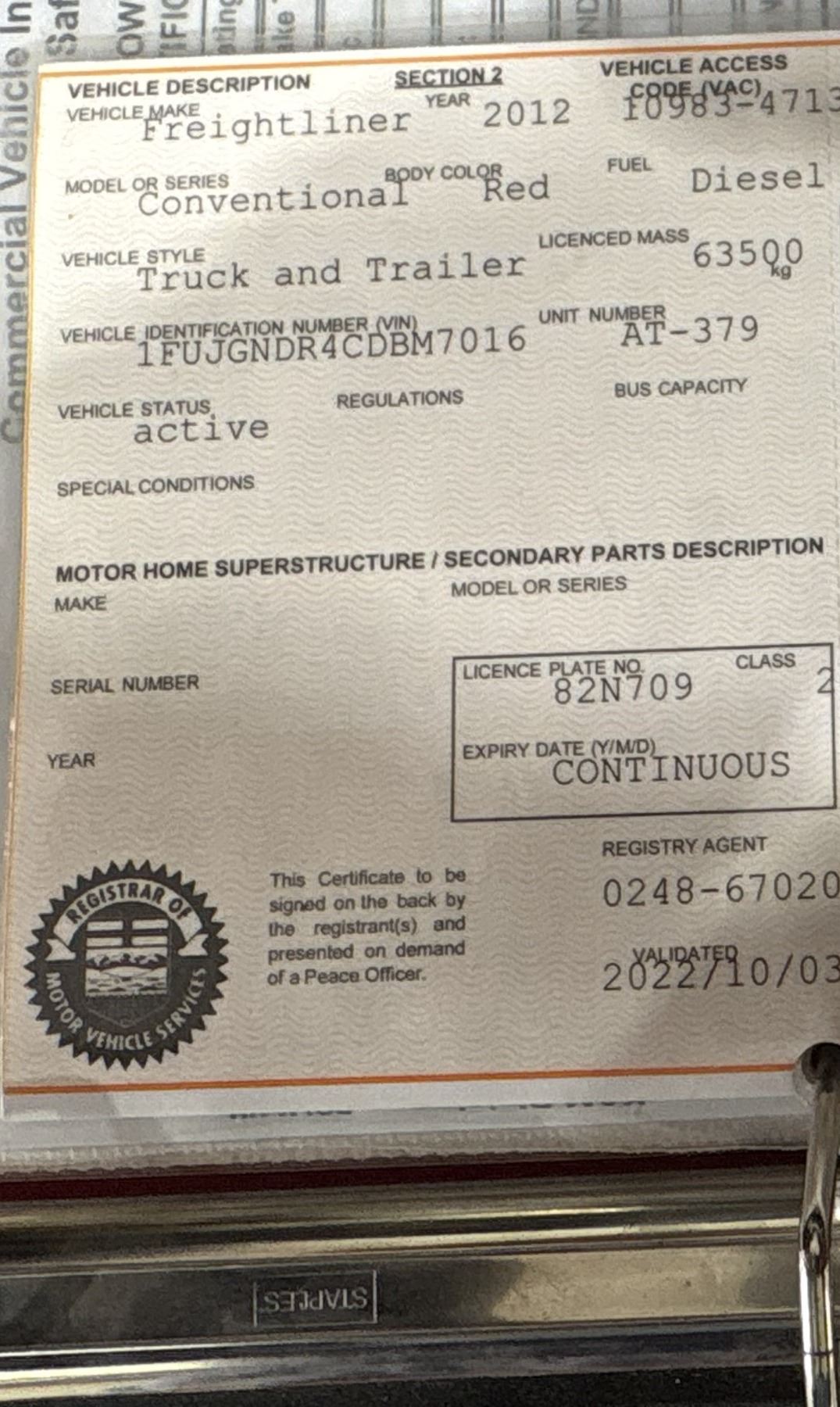 2012 Freightliner Columbia, Detroit Diesel DD15 500 HP, 935,721 km, DEF deleted, Eaton Ultrashift Auto Trans, New tires at CVIP, CVIP was done March 2026, 24.5 tires, VIN. 1FUJGNDR4CDBM7016