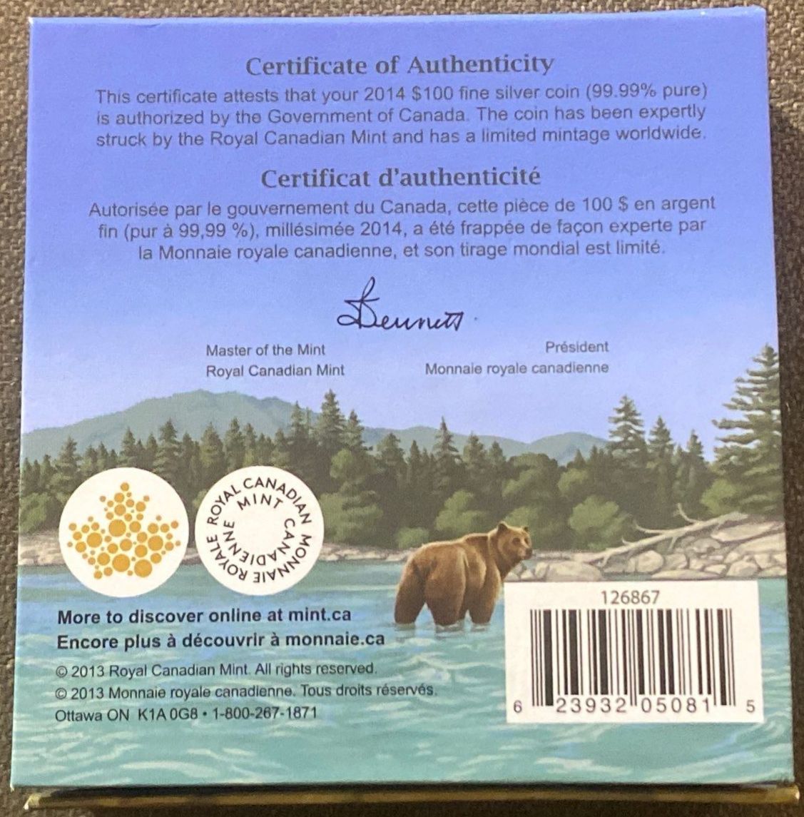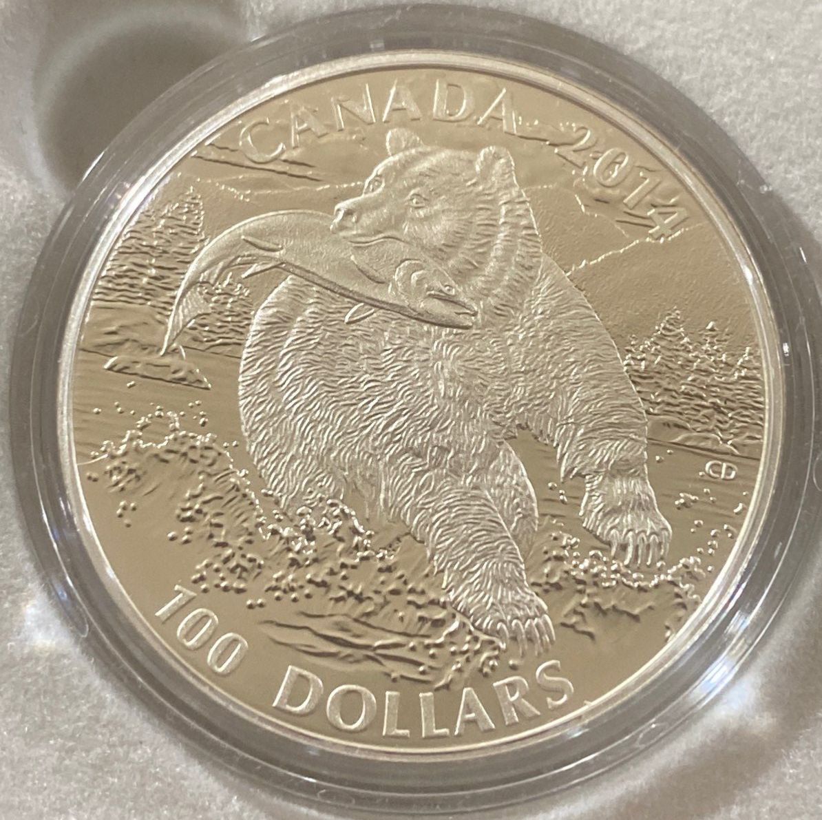Lot 1 2014 The Grizzly $100 One Troy Ounce Fine Silver Coin