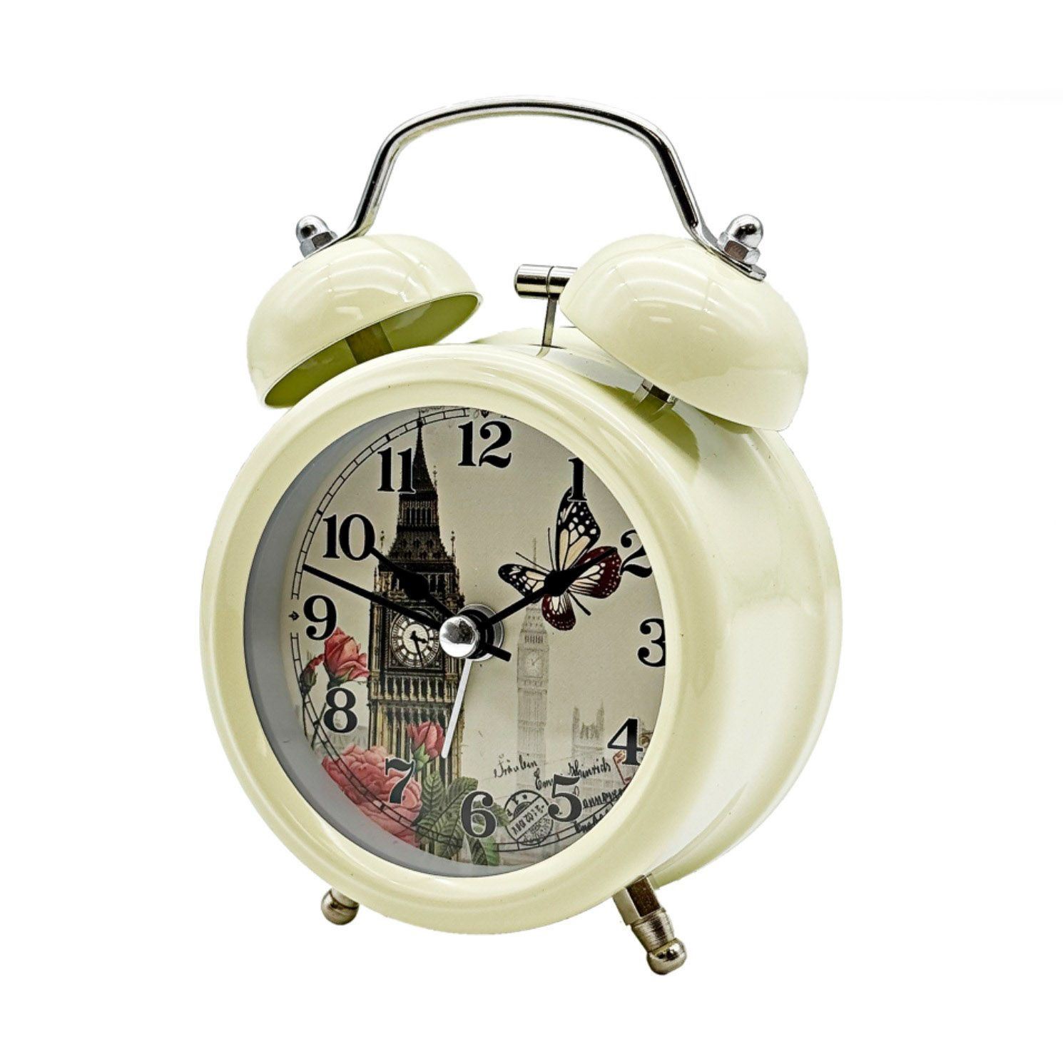 Classic white metal twin-bell alarm clock featuring a decorative vintage-style dial with London landmark artwork, floral accents, and butterfly detail. This 3-inch analog clock combines retro charm with compact functionality, making it perfect for bedside tables, desks, or decorative shelves. A stylish and timeless accent piece with easy-to-read numerals. Ð A7682