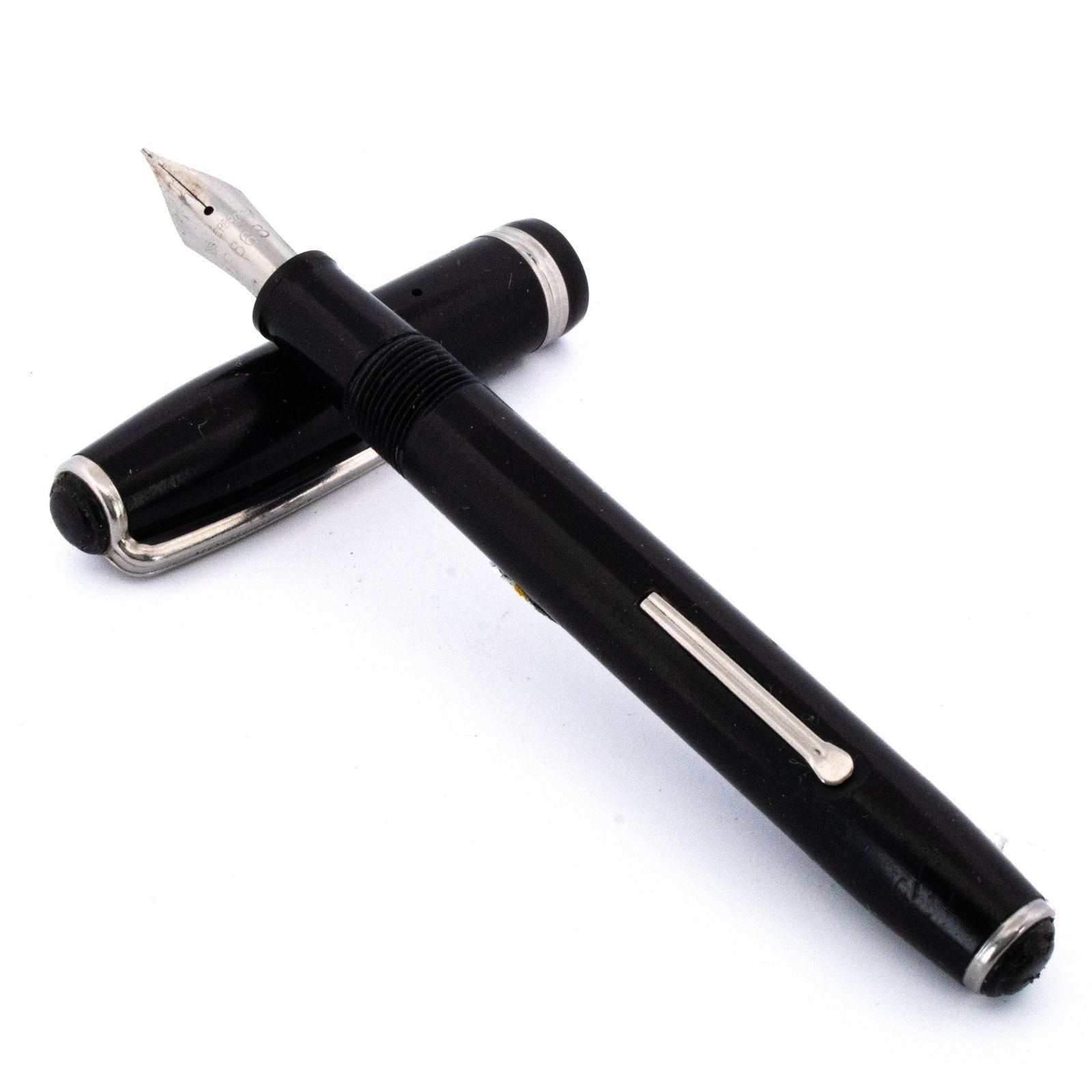 Classis mid-century Esterbrook fountain pen featuring a polished black barrel with bright chrome (silver) clip and trim, fitted with the desirable No. 2668 Renew-Point nib. Produced during the golden era of American pen manufacturing (circa 1940sÐ1950s), this model is part of the renowned J/SJ series, celebrated for reliability and interchangeable nib systems.