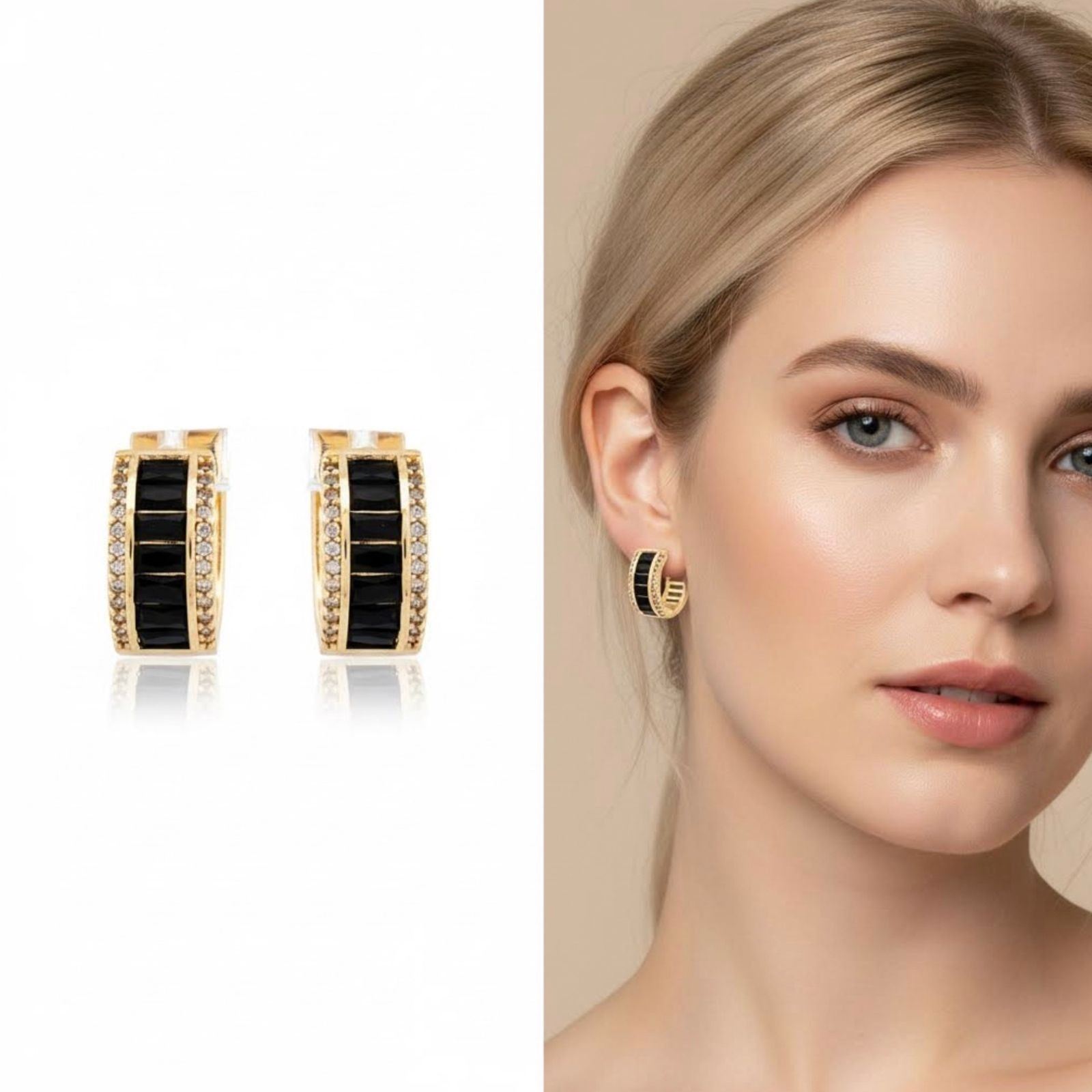 18kt Gold-Overlay Oro Laminado Hoop-Style Earrings featuring Black Stone Baguette Accents with Lever-Back Closures. Ð A7727