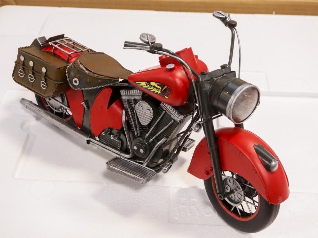 This is a detailed tabletop model of a vintage motorcycle. The model is predominantly red with black and silver accents, featuring realistic details like a headlight, engine components, and spokes. It has a pair of brown saddlebags with decorative elements, providing a classic look. The model is likely made from metal and plastic materials, designed as a decorative piece for enthusiasts or collectors of motorcycle memorabilia. Ð EBC-486