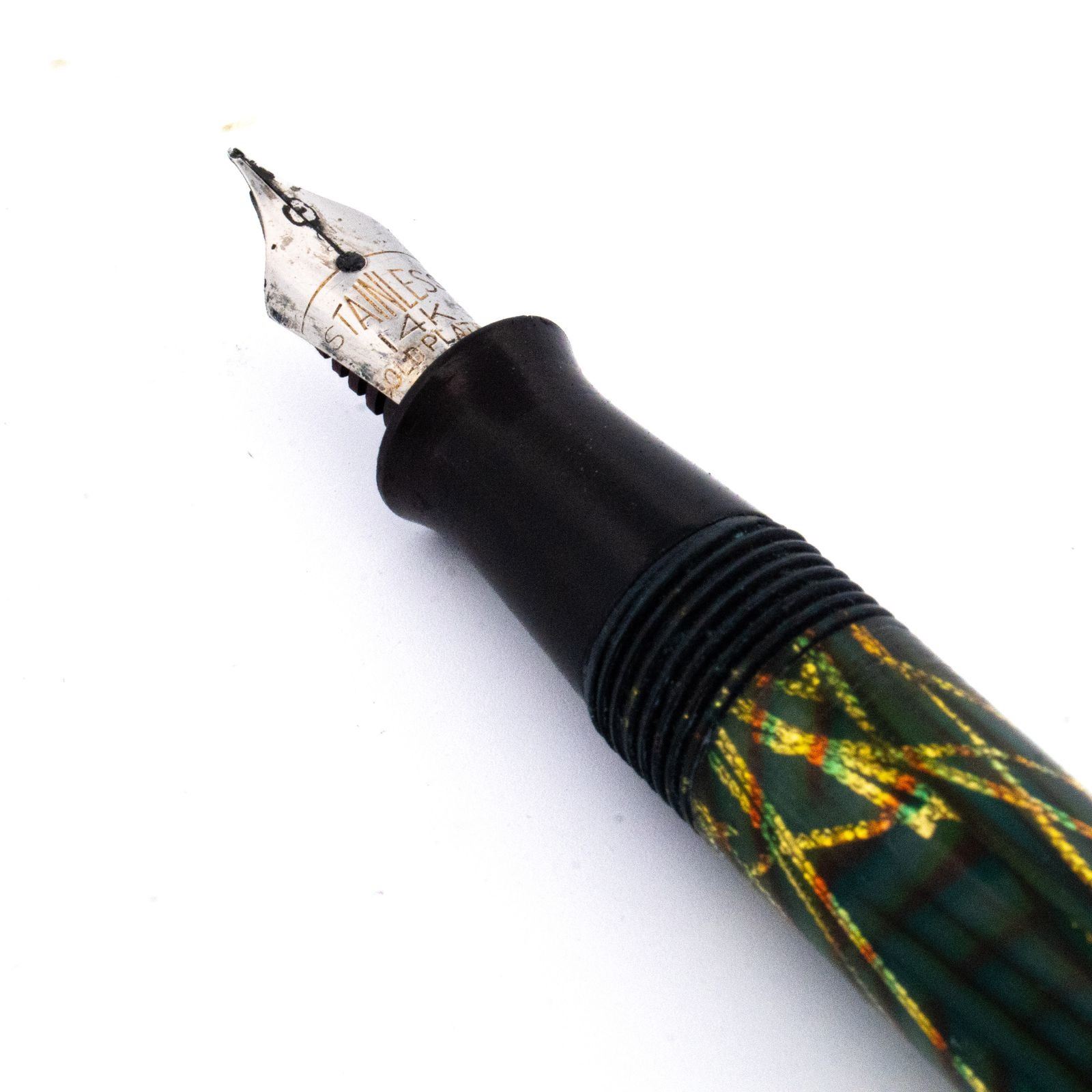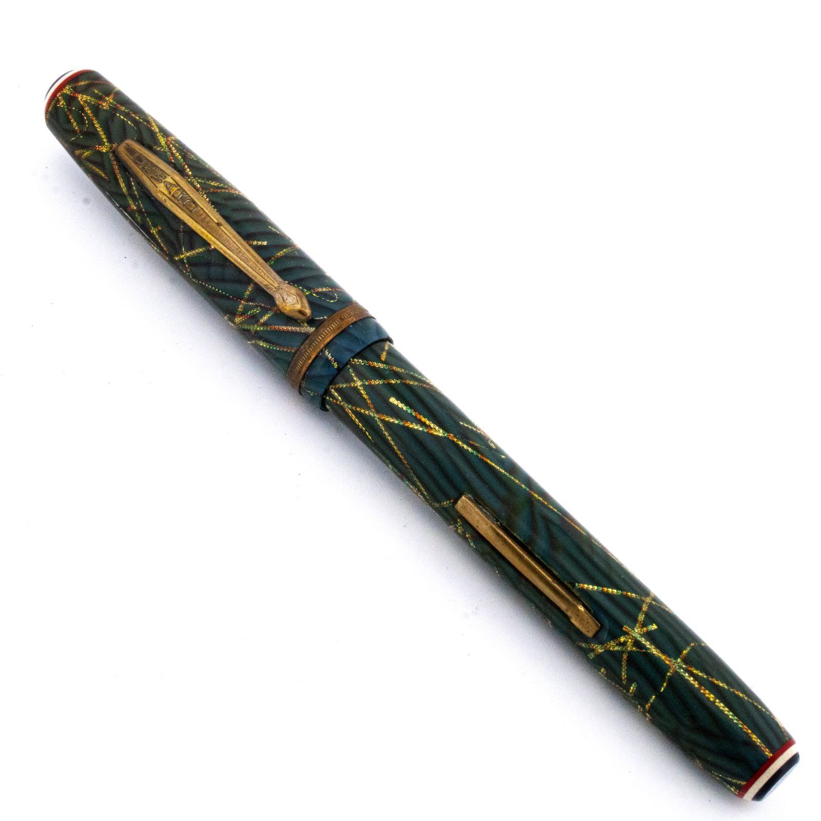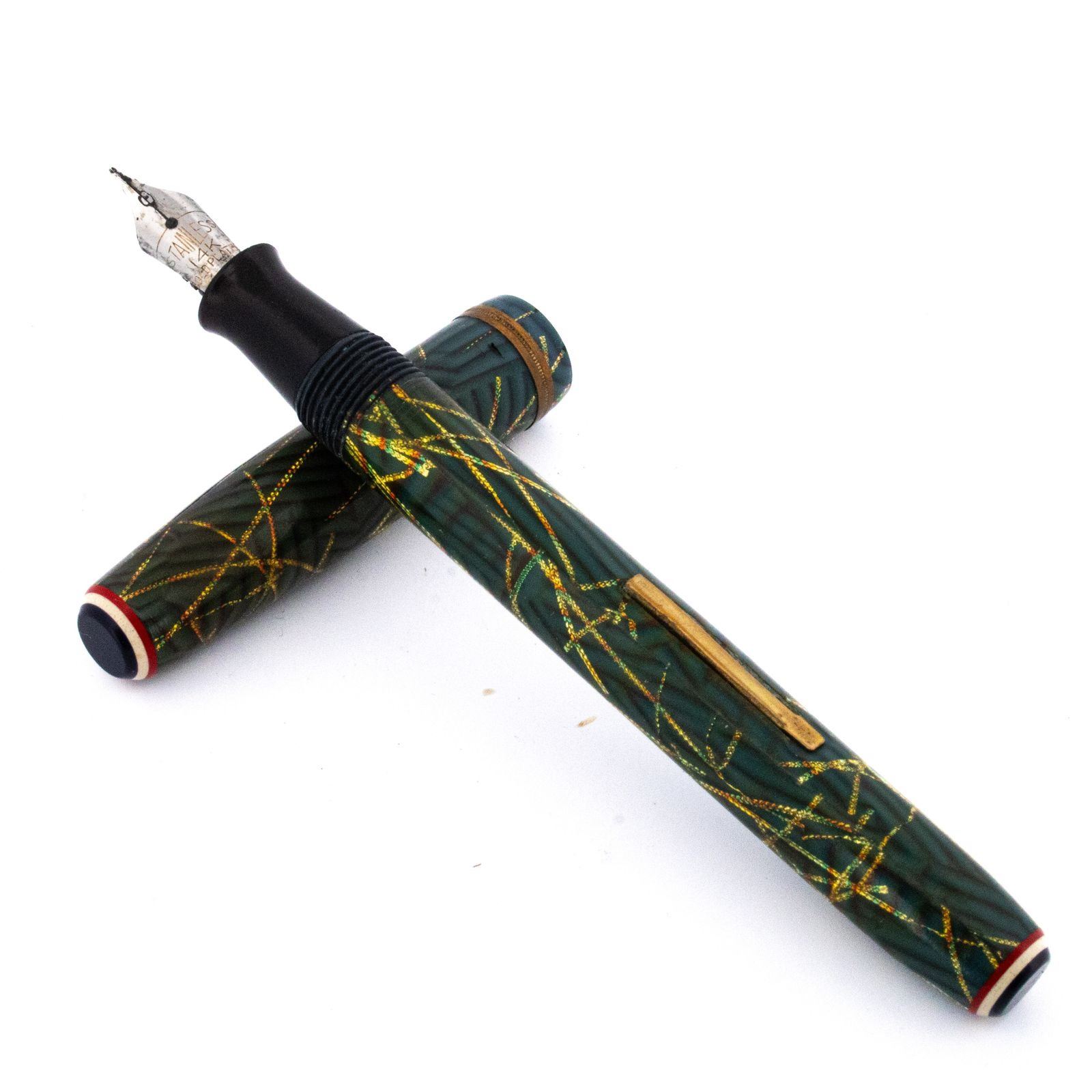 Likely dating to the 1930sÐ1950s, this pen embodies the bold color combinations and craftsmanship of the era. The gold nib offers a smoother writing experience with potential for light flex, making it both a functional writing instrument and a desirable collectorÕs piece. Ð PEN144