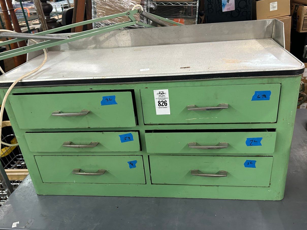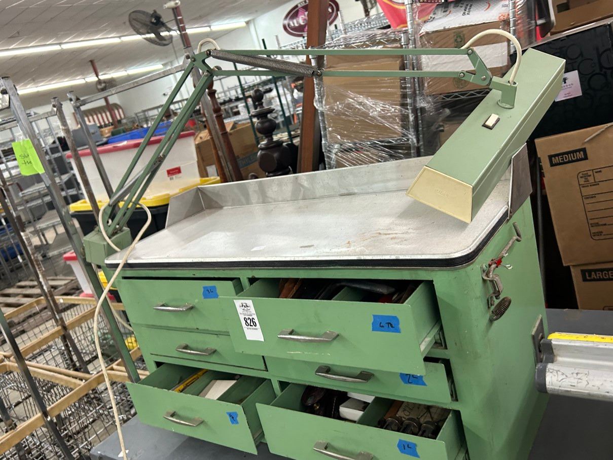 Lot 826 Metal Vintage 6 Drawer Tool Cabinet w/Asst. Tools/Hardware, Flex Boom Lamp