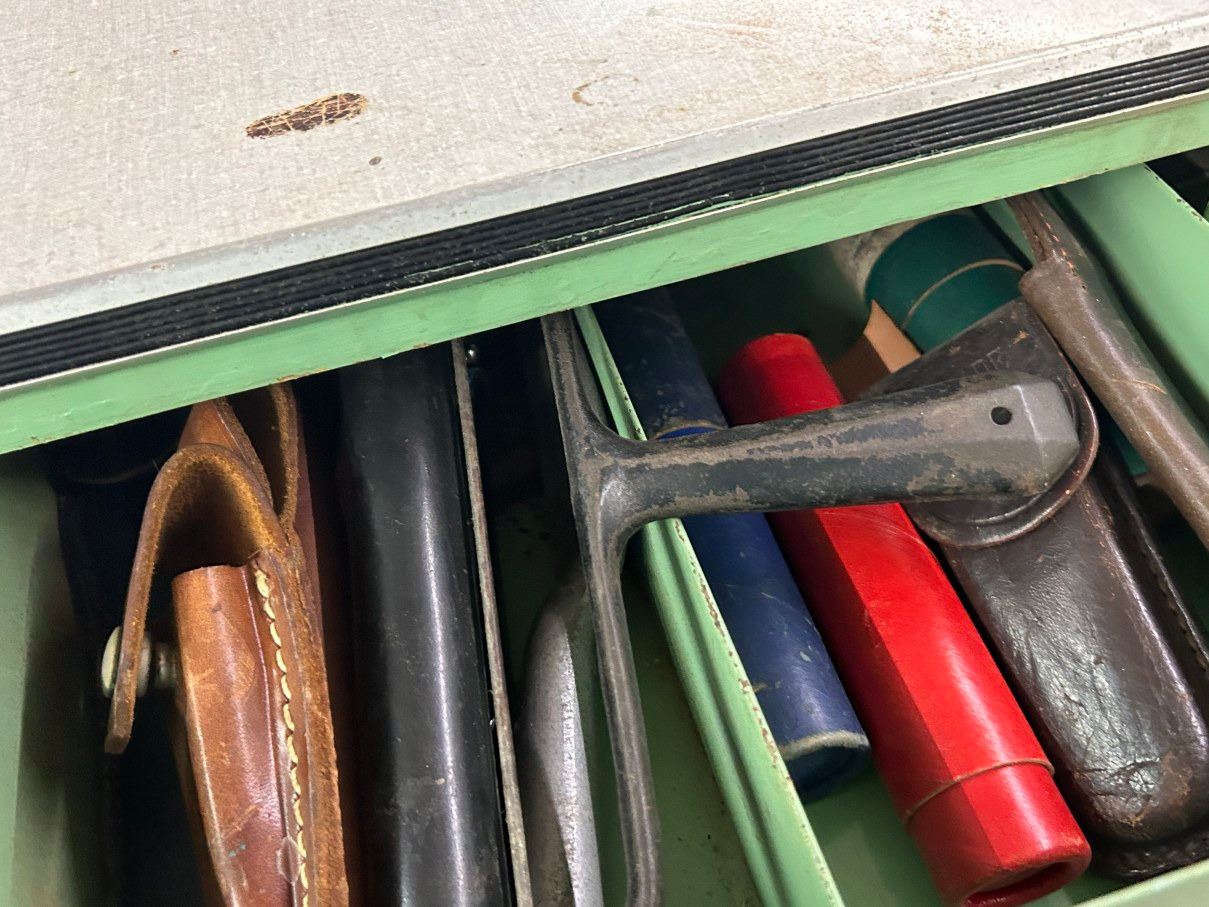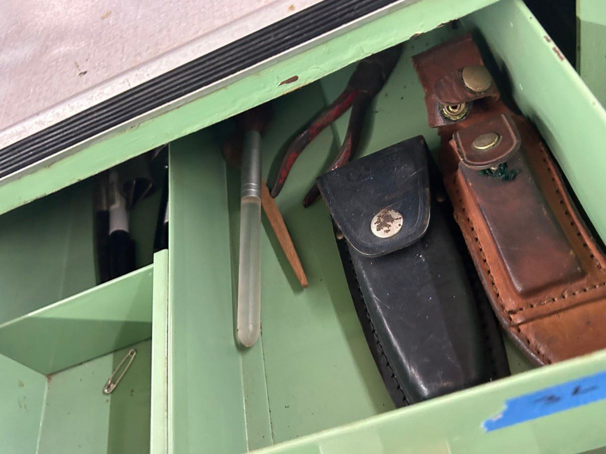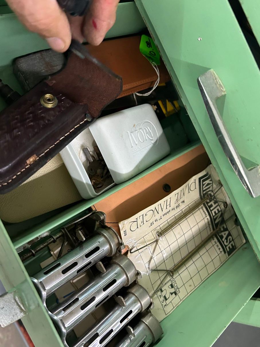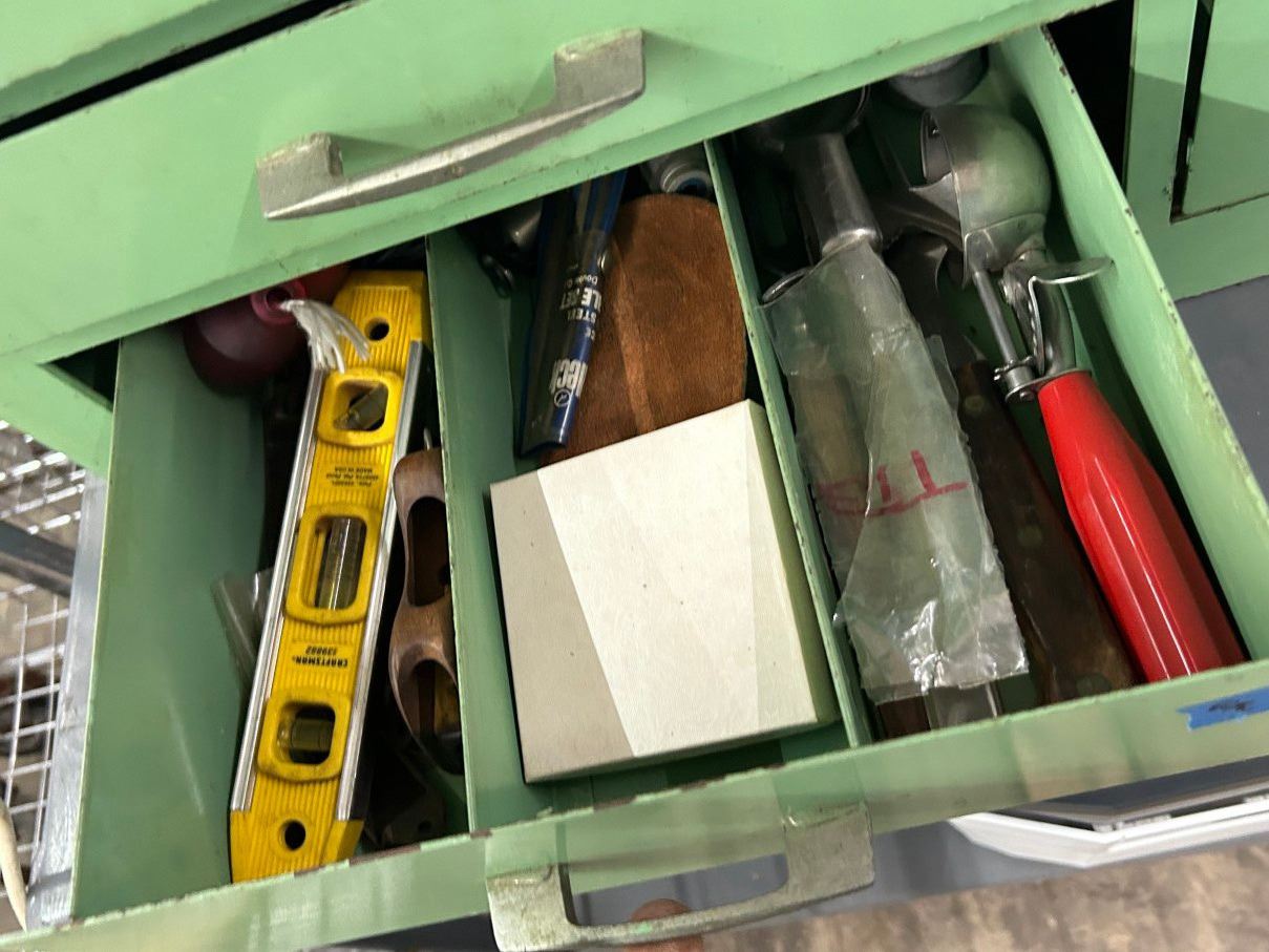 Metal Vintage 6 Drawer Tool Cabinet w/Asst. Tools/Hardware, Flex Boom Lamp