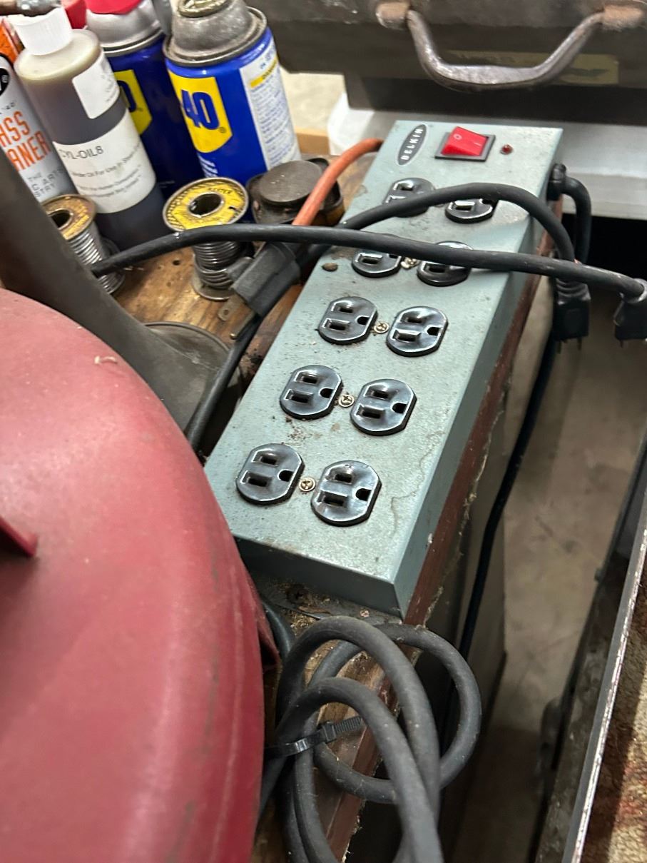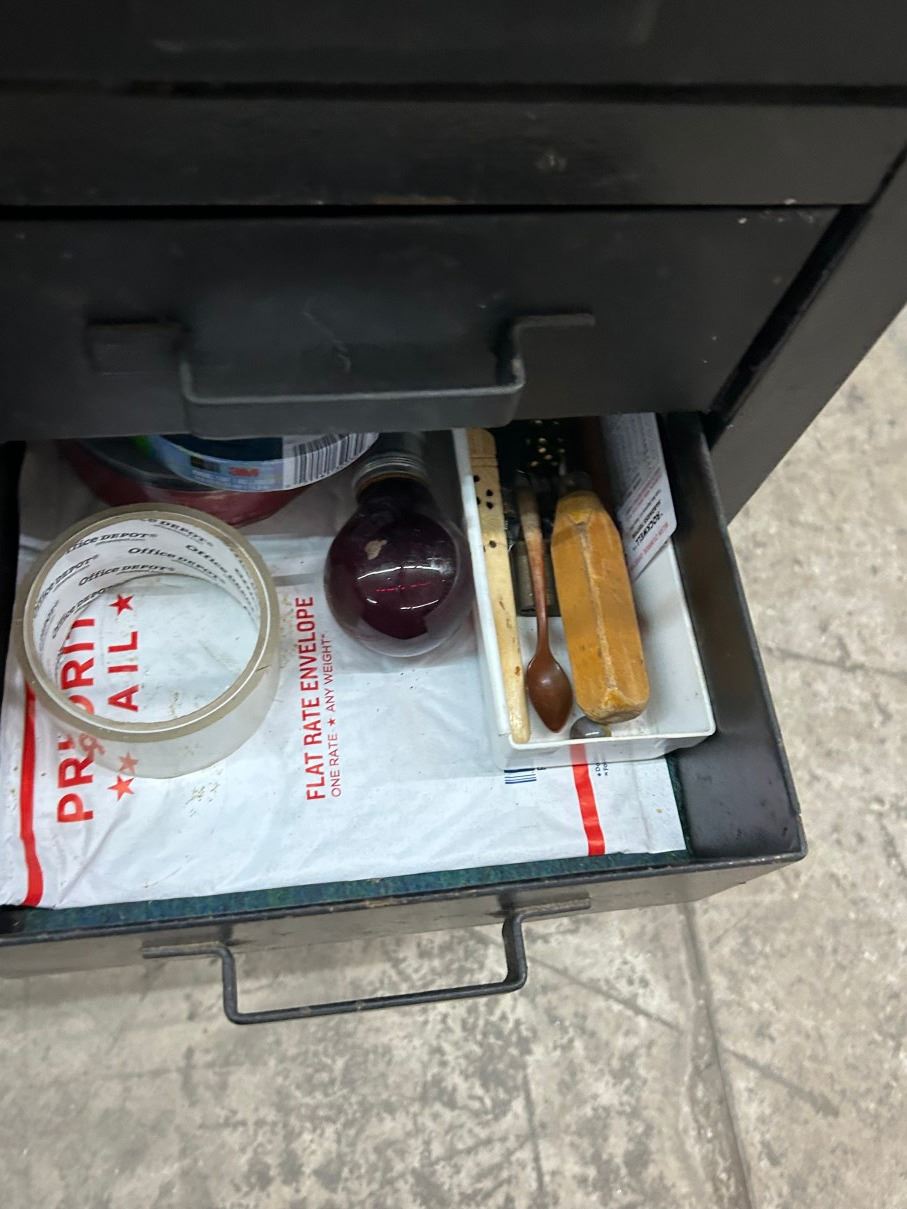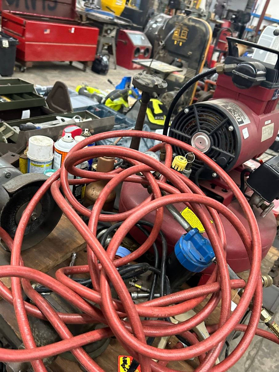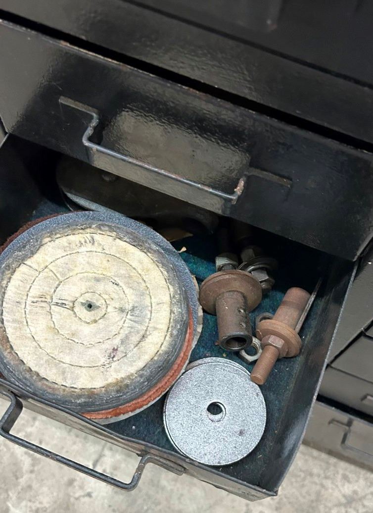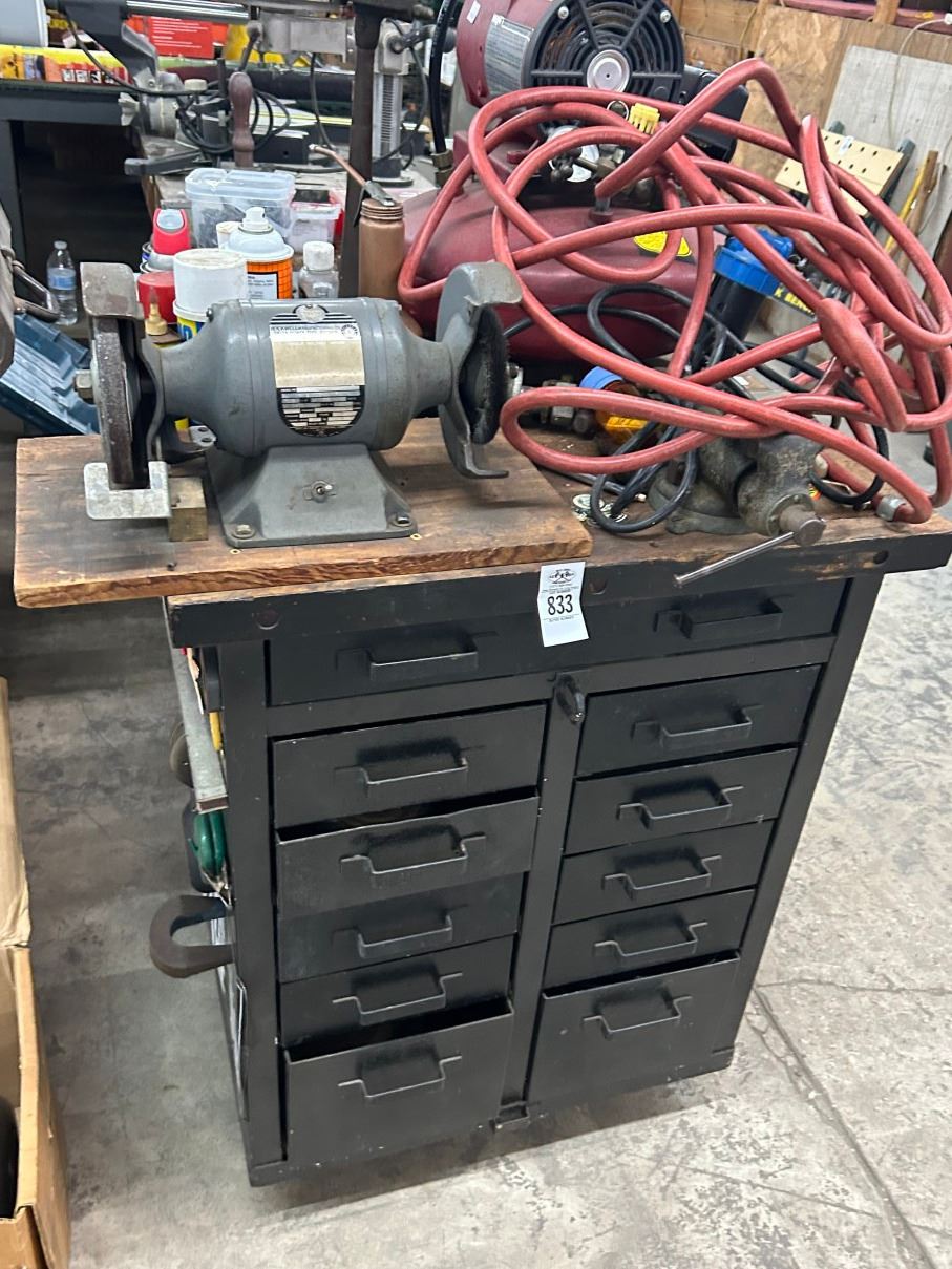 Lot 833 11 Drawer Rolling Tool Chest w/Asst. Supplies, Bench Grinder, Air Compressor,