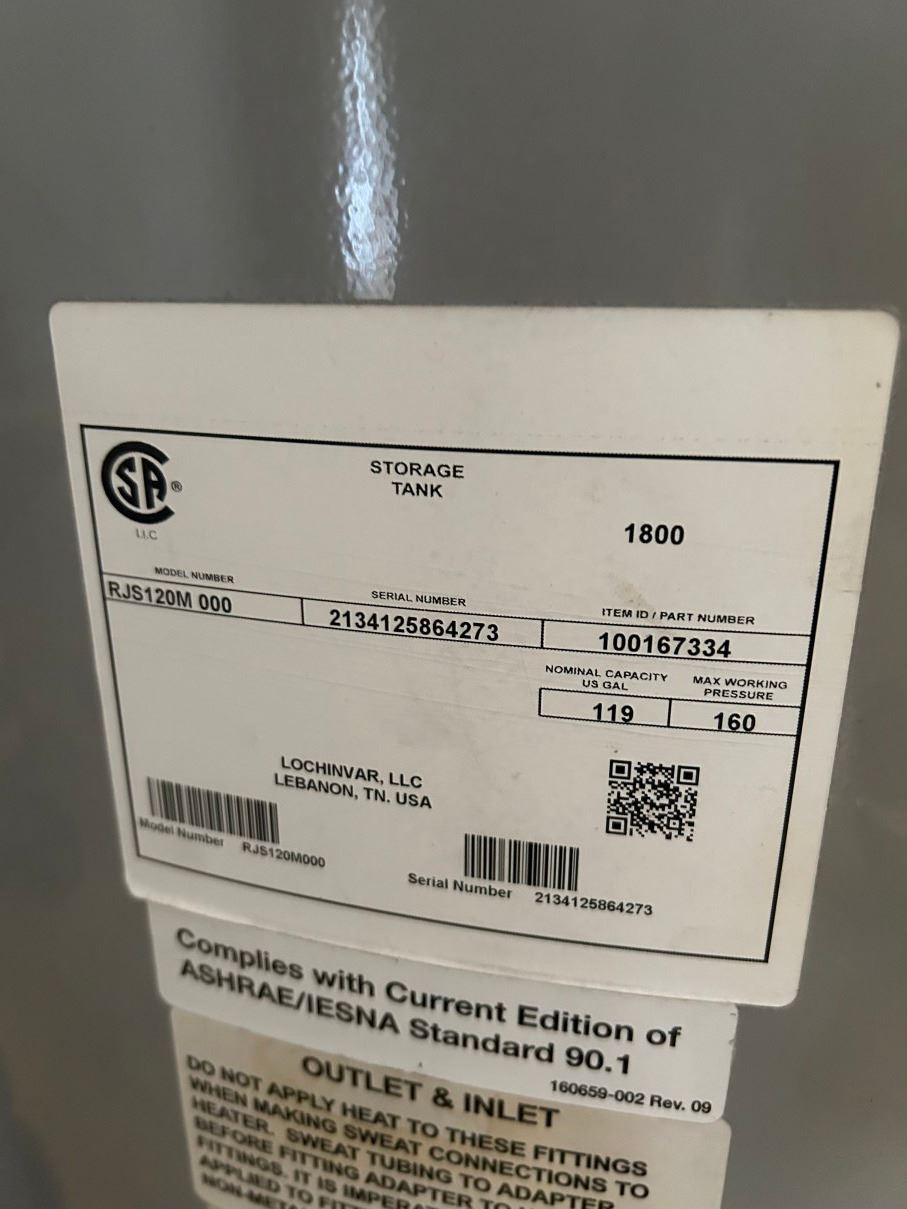 Lot 50k Lochinvar Double Water Heater System - RJS120M000 - 119 Gal. Each