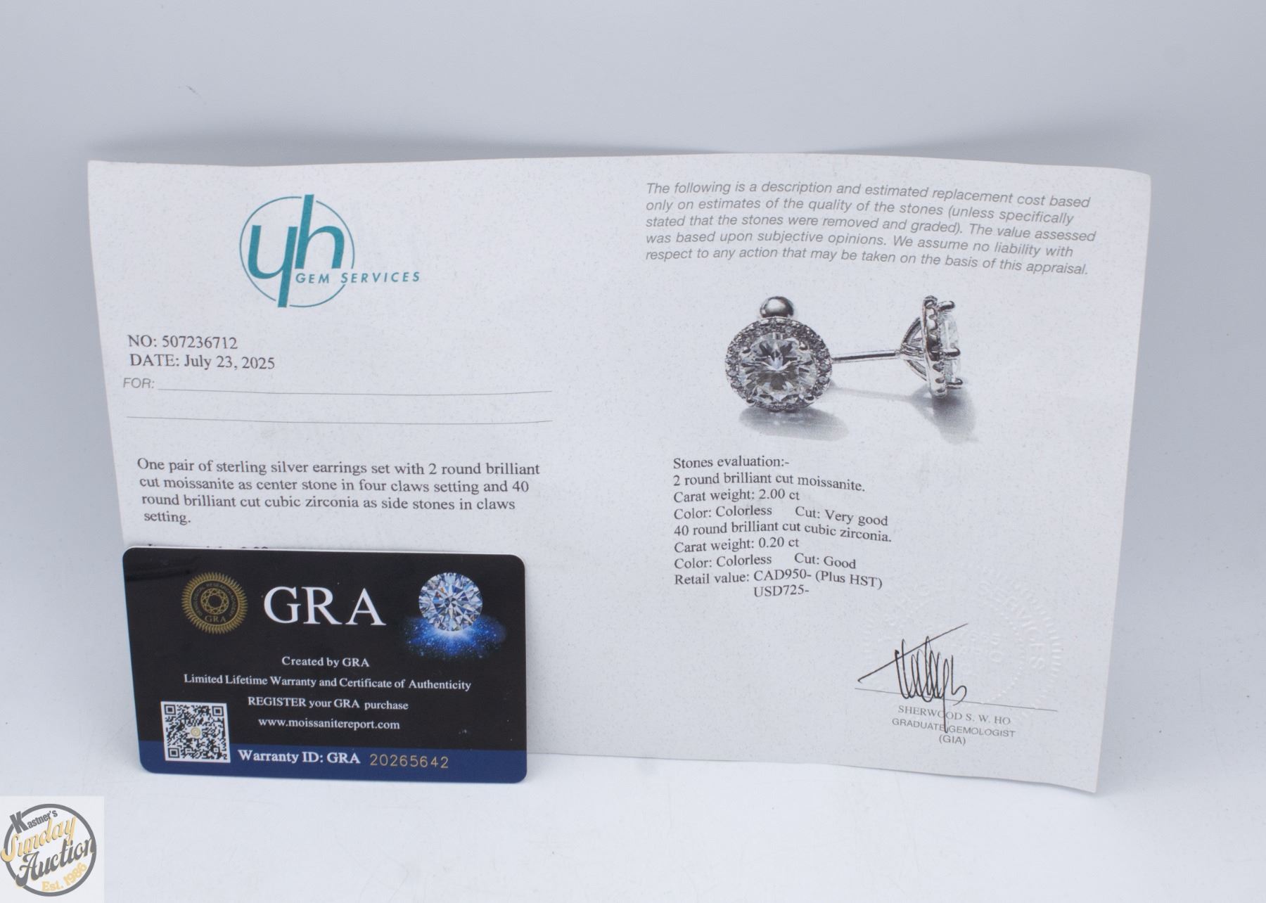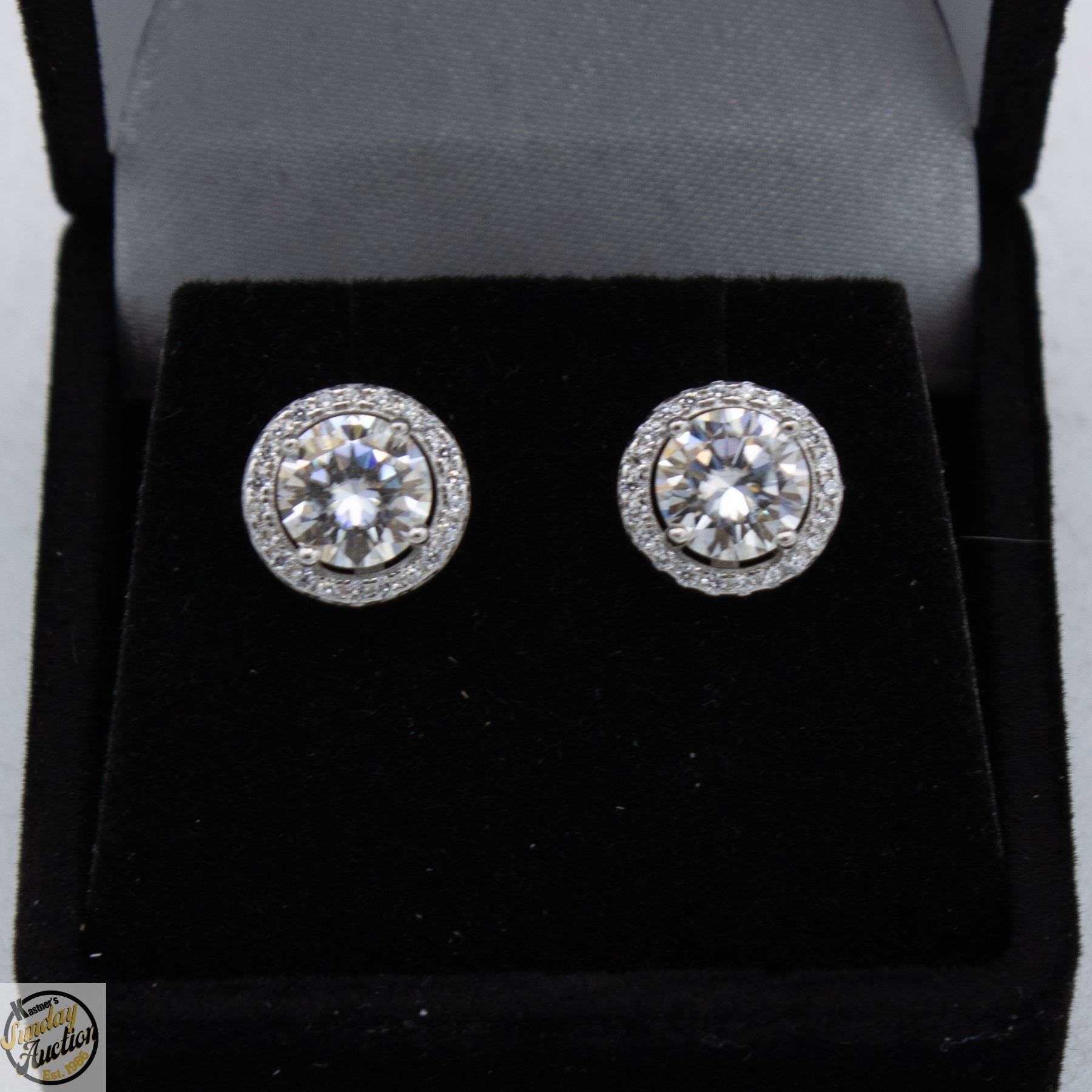 CUT MOISSANITE STONE VVS D COLOR WITH 40 ROUND BRILLIANT CUT CUBIC ZIRCONIA SET IN ROUND HALO SET IN 925 SILVER EARRINGS RETAIL VALUE $950.00 **ALL ITEMS MUST BE REMOVED BY 5PM SATURDAY, APRIL 25TH 2026. ALL REMAINING ITEMS WILL BE SUBJECT TO A $6.00 PER DAY STORAGE CHARGE. ANY ITEMS REMAINING AFTER MONDAY, MAY 11TH 2026 WILL BE CONSIDERED FORFEITED. NO REFUNDS WILL BE ISSUED FOR FORFEITED ITEMS. TO SCHEDULE A PICK UP APPOINTMENT CLICK HERE