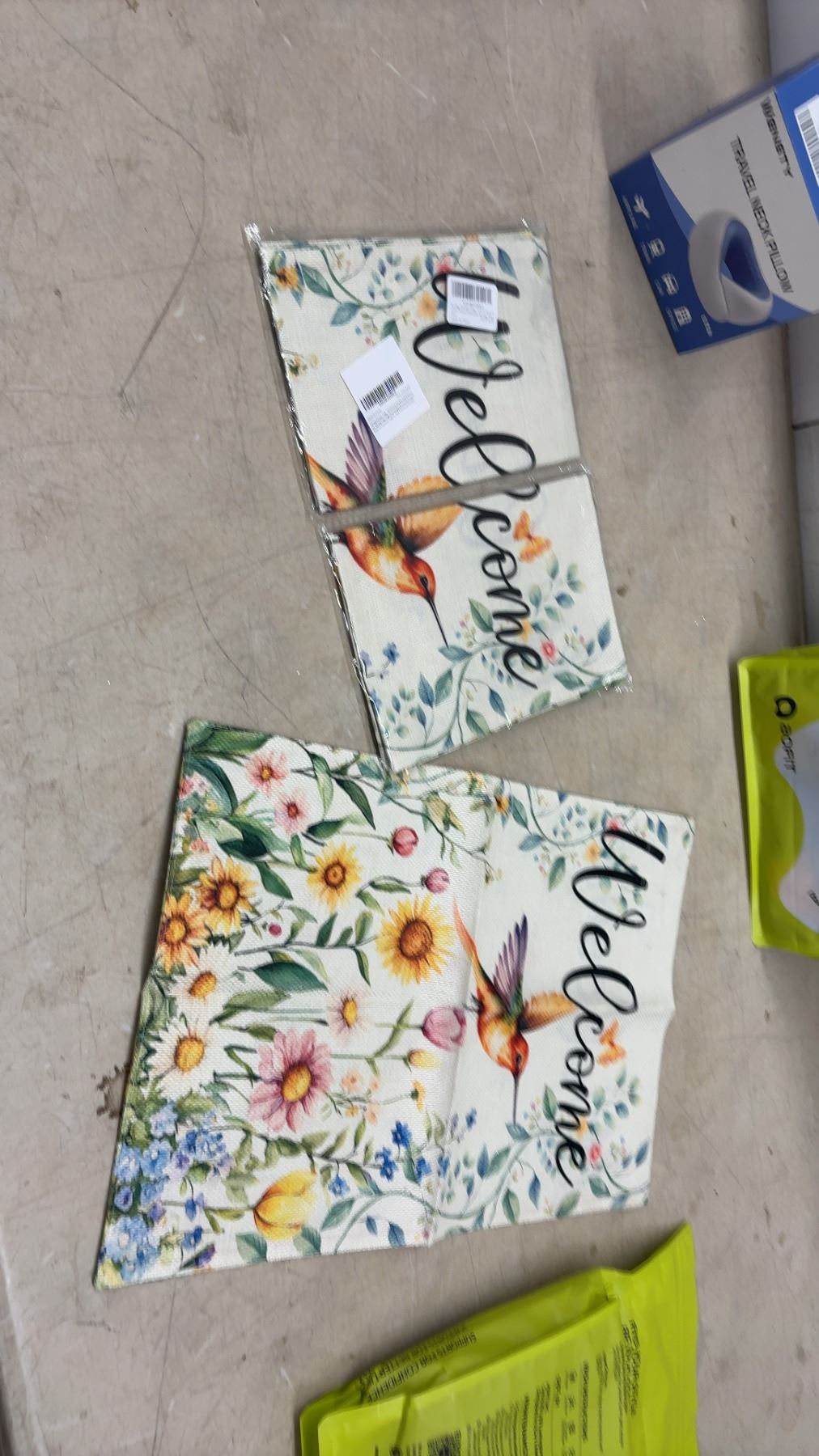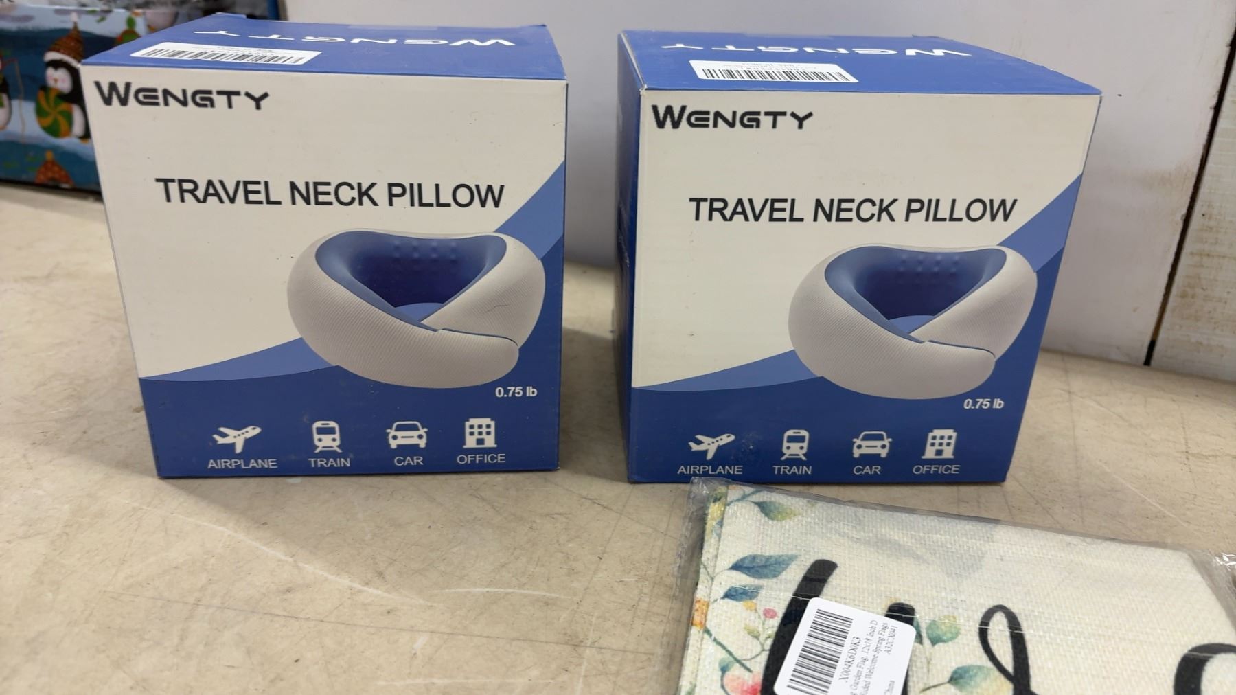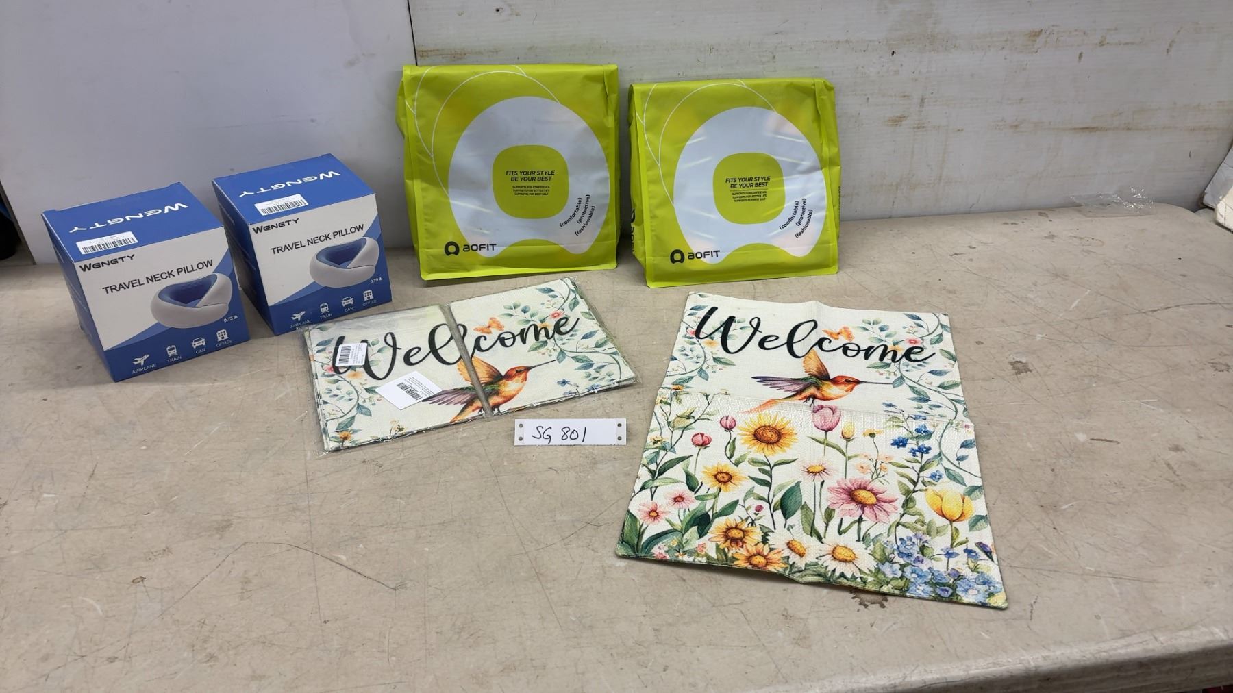 Lot 801 2 New AOFIT Braces, 2 Travel Neck Pillows, and 3 Spring Garden Flags, 12x18"