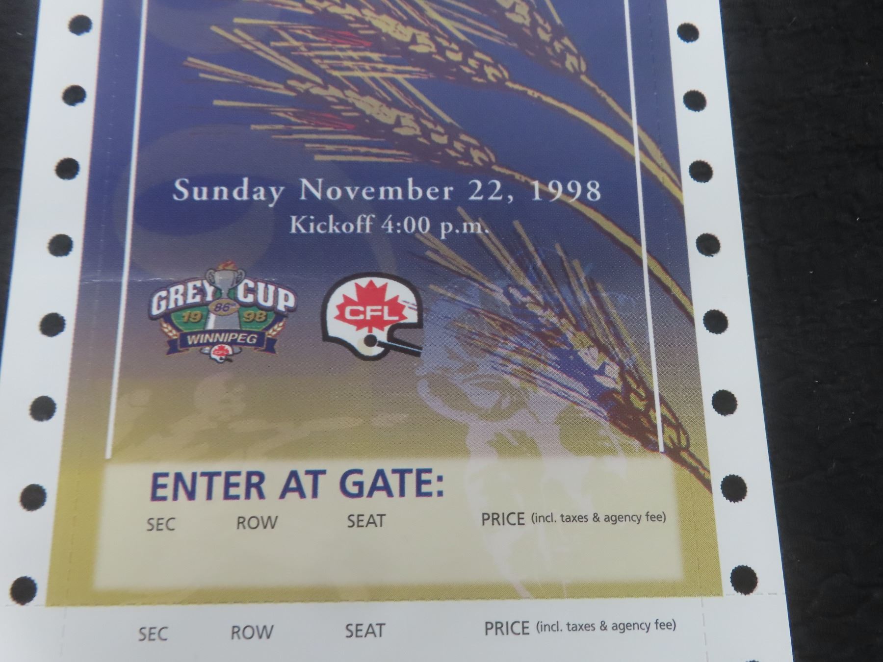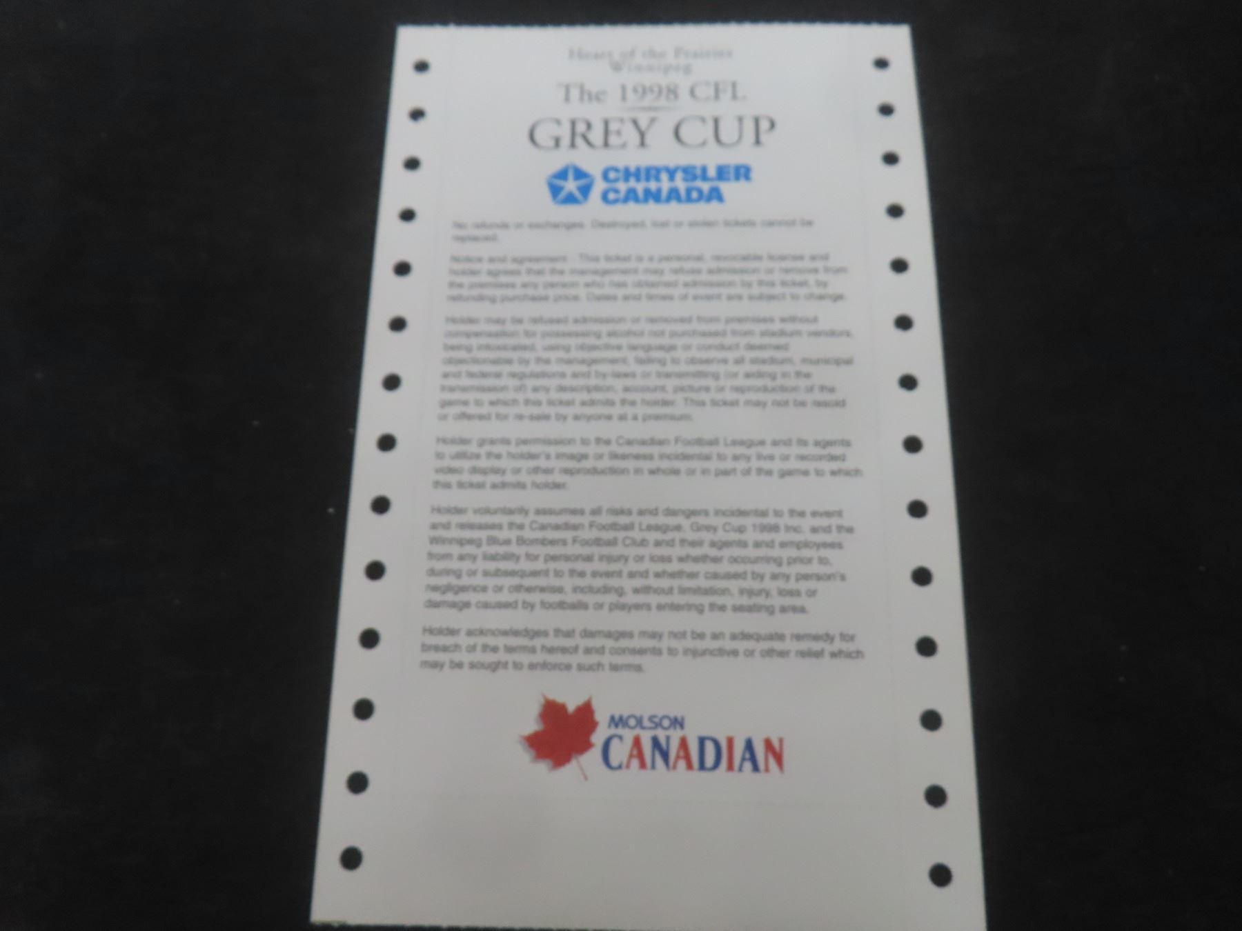 Unprinted 1998 Grey Cup Ticket