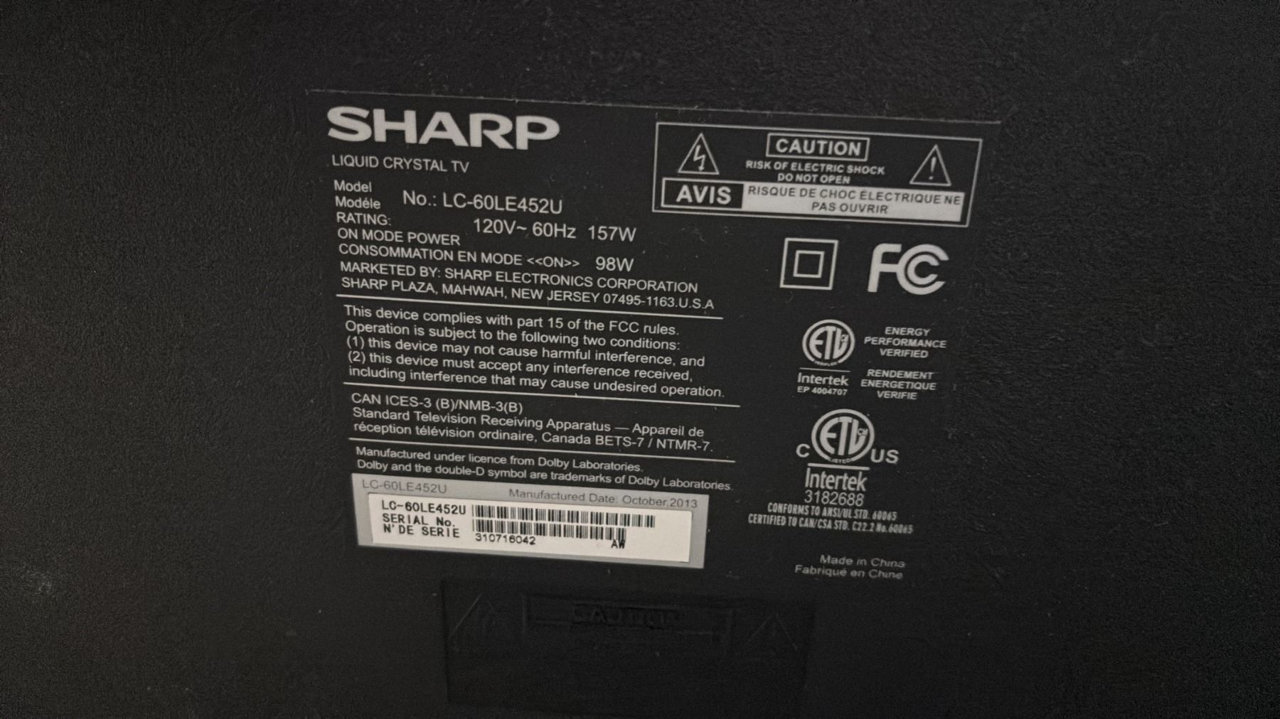 *TESTED WORKING* SHARP AQUOS 60" TV WITH POWER CORD & STAND (NO REMOTE)