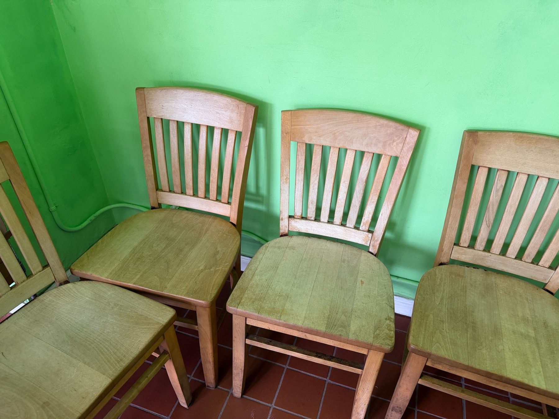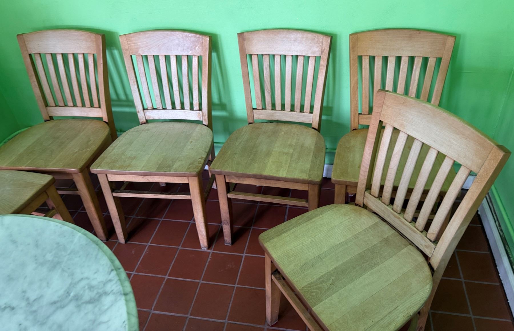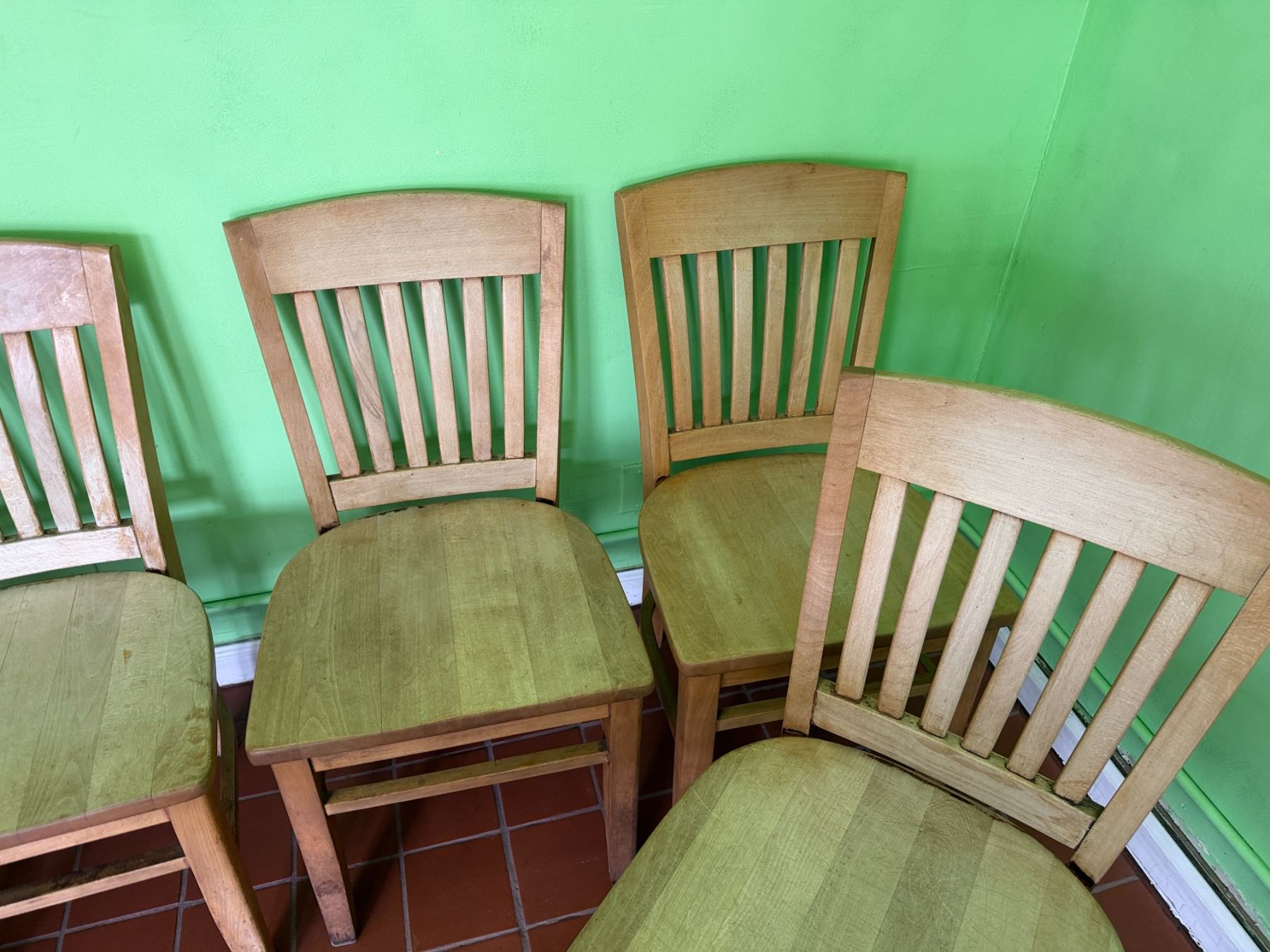 Qty 6 Wooden Chairs w/ Slatted Backs 18" x 16" x 34"H (some wobble)