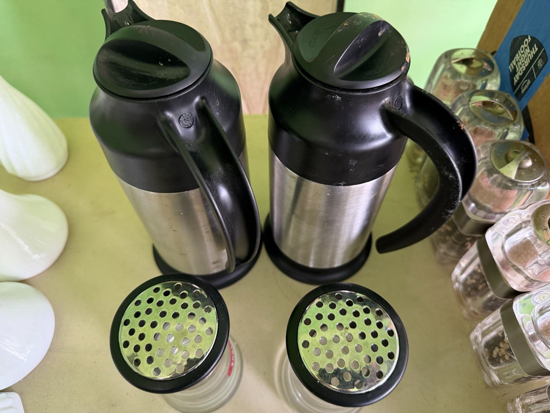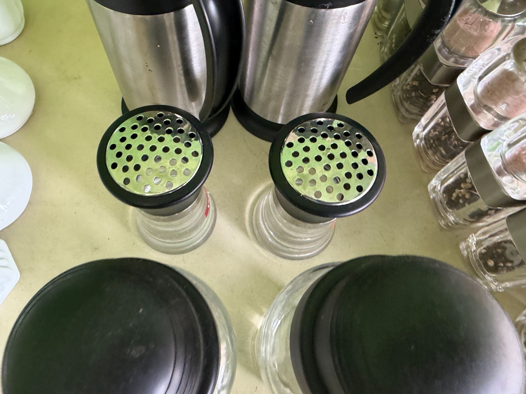 Qty 2 Metal Coffee Carafes & 2 Shakers w/ Black Lids