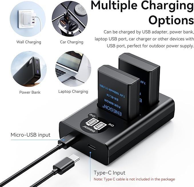 - EN-EL14/EL 14a Replacement Battery 1500mAh(2 Pack) and Smart LED Dual Charger Kit for Nikon EN-EL14/14a and Compatible with D3100, D3200, D3300, D3400, D3500, D5100, D5200, D5300, D5500, Coolpix P7000