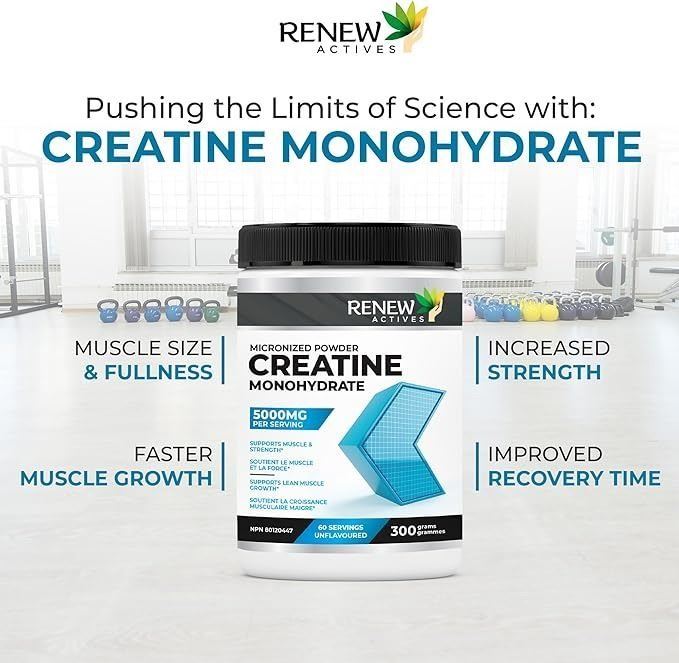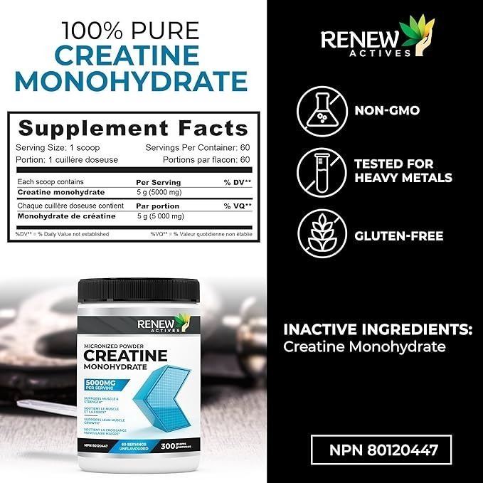 - RENEW ACTIVES Micronized Creatine Monohydrate – 100% Pure, Vegan & Keto-Friendly, 5000mg Per Serving – Supports Muscle Growth, Strength & Performance – Made in Canada – Unflavored, 60 Servings