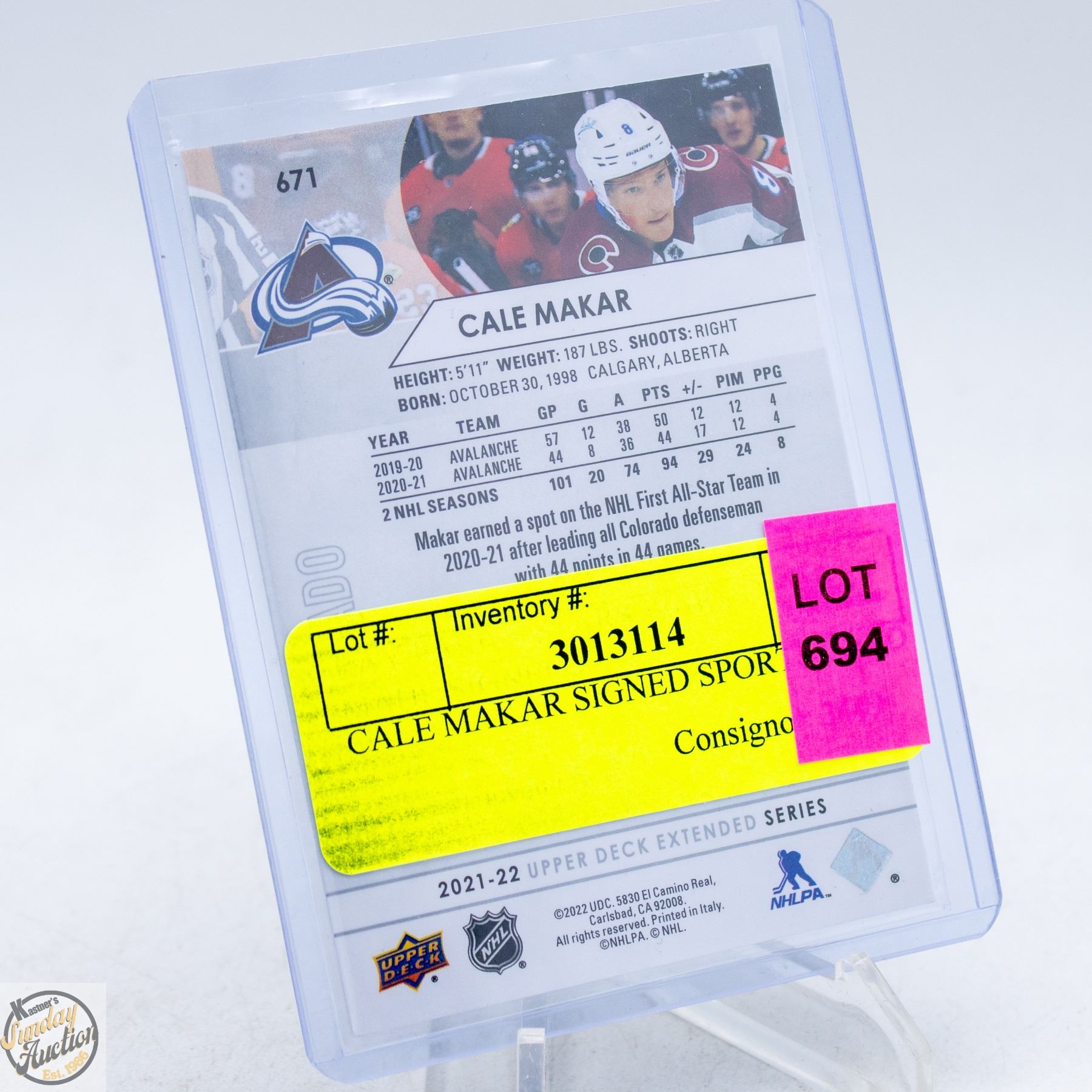 Lot 694 CALE MAKAR SIGNED SPORTS CARD