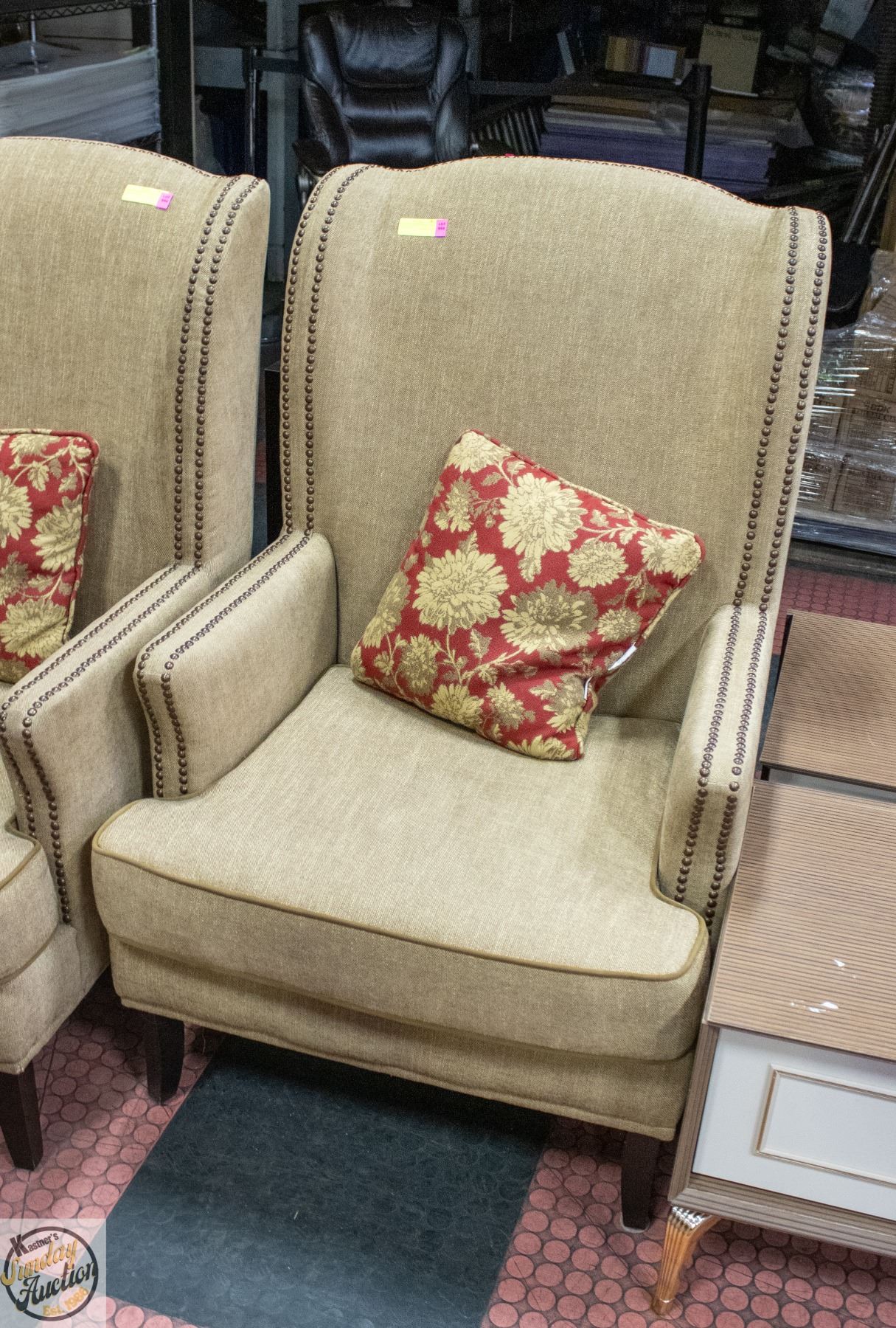 Lot 955 WING BACK CHAIR UPHOLSTERED W TACK DETAILS