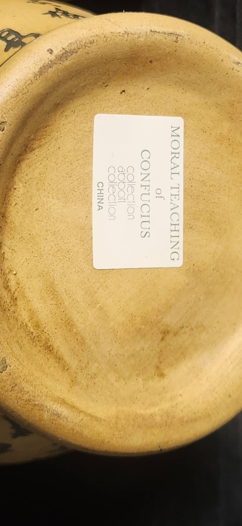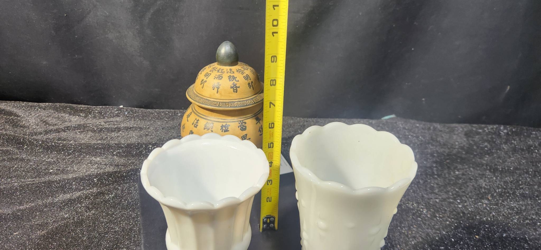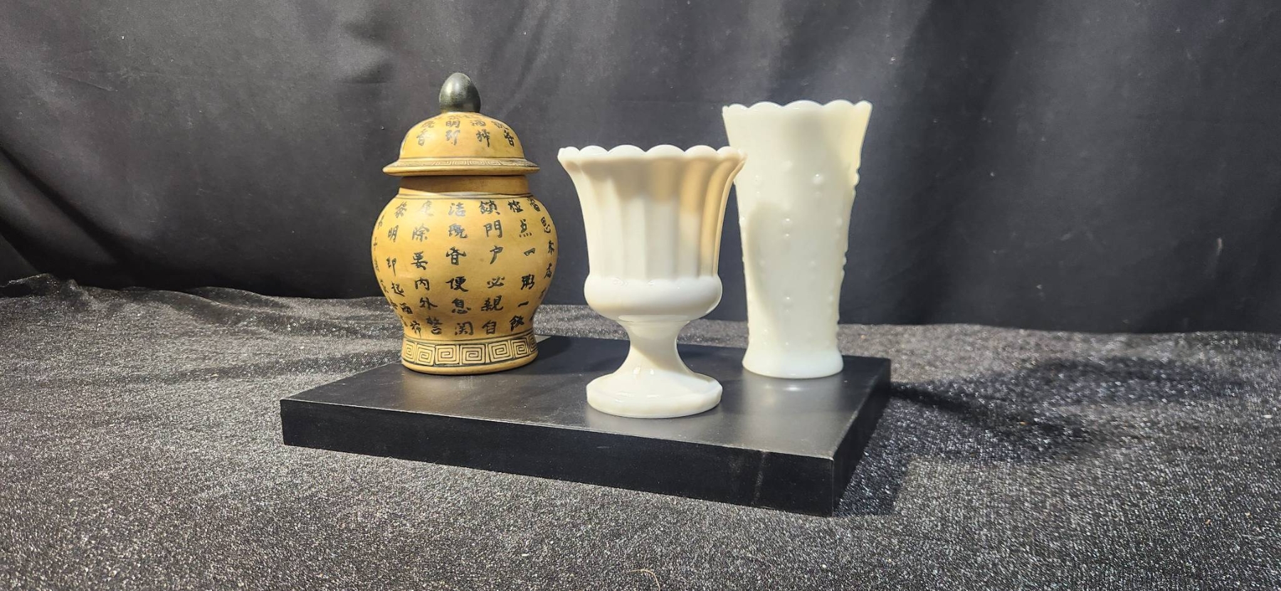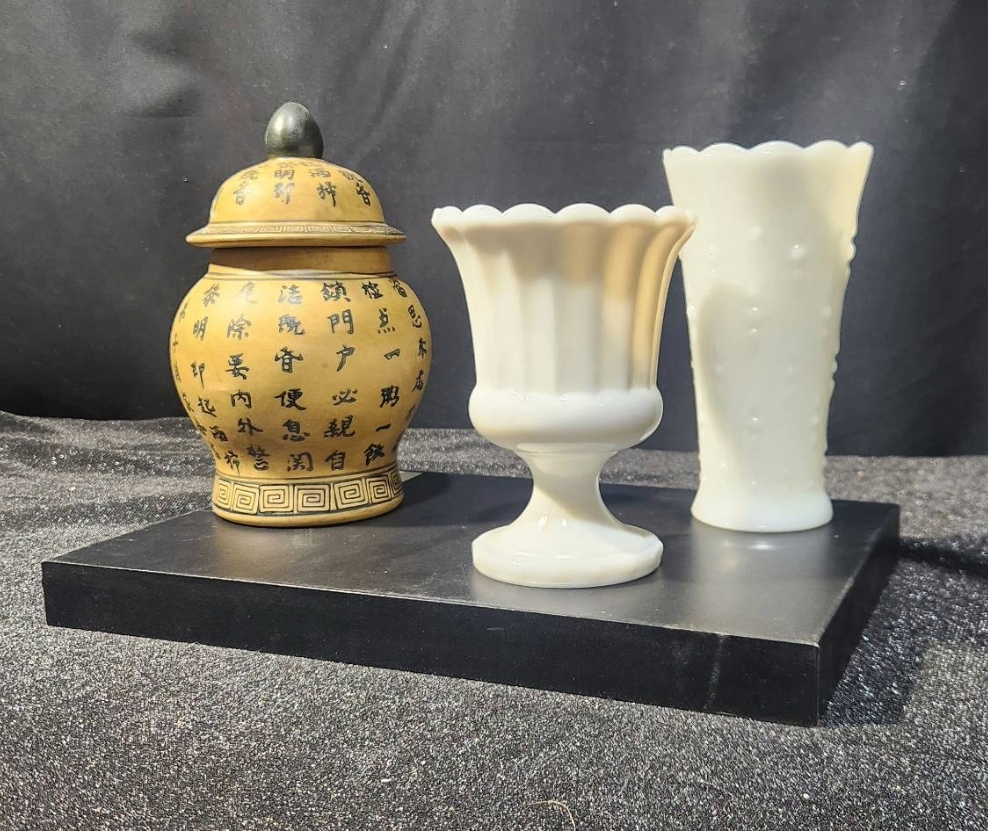 Decorative urn inscribed with Confucius teachings, marked on the base, and crafted in a tan finish with black script details. Also includes two elegant milk glass vases—one with a scalloped top and raised dot pattern, and the other in a pedestal style with fluted accents. Ideal as decorative display pieces or thoughtful gifts. Good overall condition; minor wear consistent with age and use.