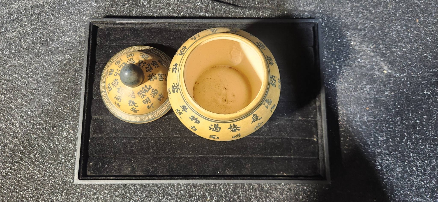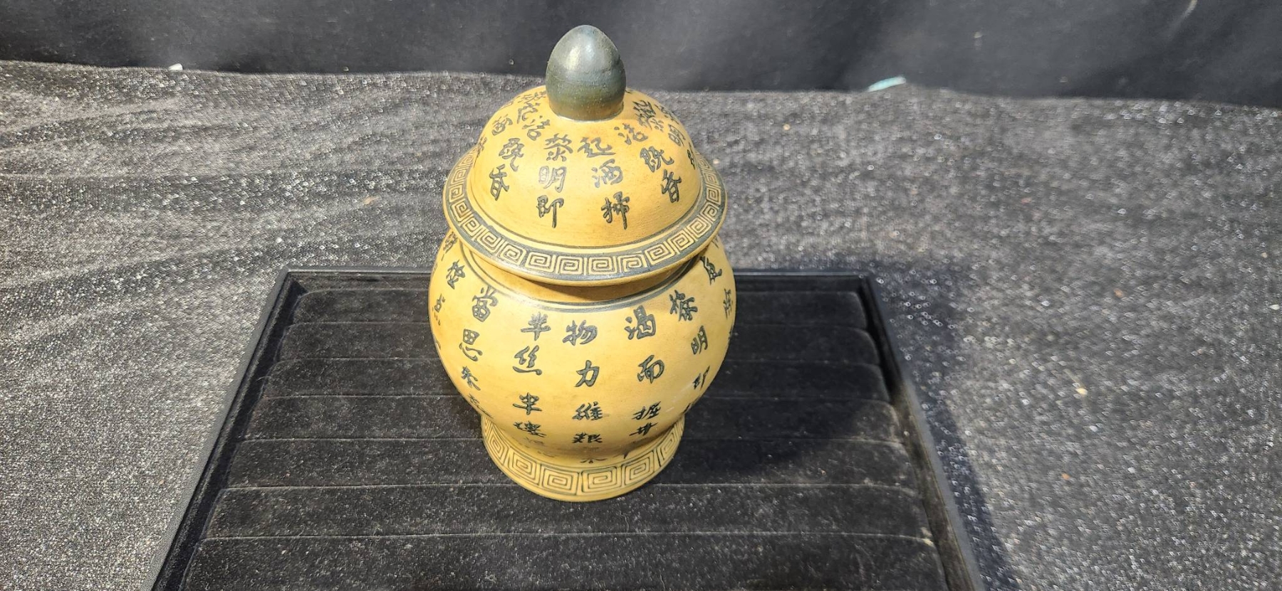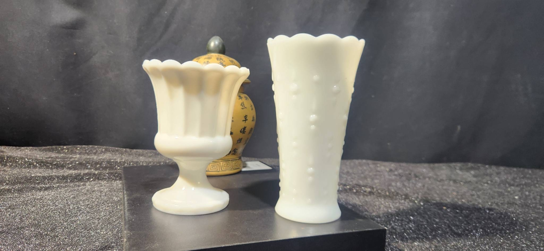 Decorative urn inscribed with Confucius teachings, marked on the base, and crafted in a tan finish with black script details. Also includes two elegant milk glass vases—one with a scalloped top and raised dot pattern, and the other in a pedestal style with fluted accents. Ideal as decorative display pieces or thoughtful gifts. Good overall condition; minor wear consistent with age and use.