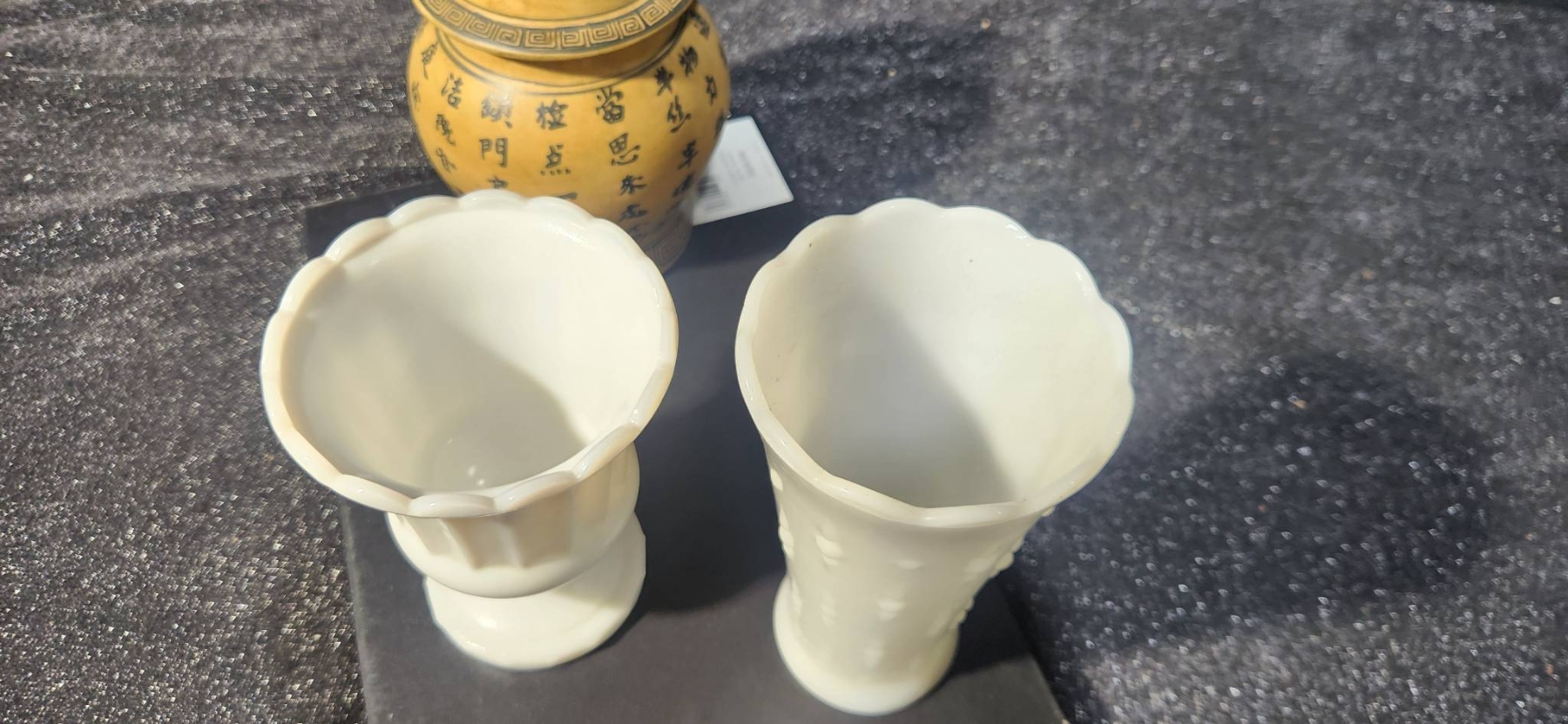 Lot 8 Confucius Teachings Urn and Pair of Milk Glass Vases