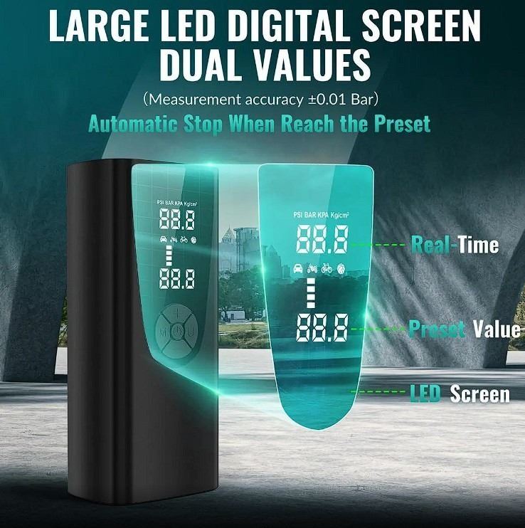 - This portable air compressor supports USB-C fast charging and is equipped with dual-function LCD digital backlight display. Even in low-light conditions, it can clearly show the tire pressure, ensuring convenient use at night