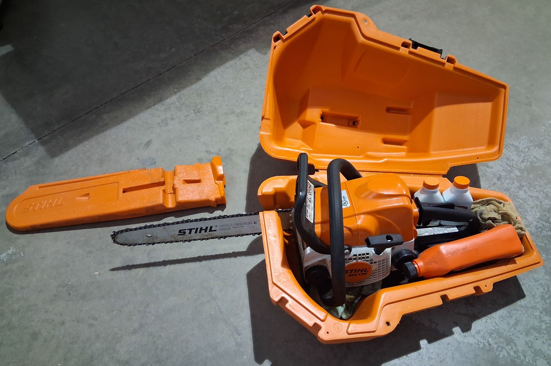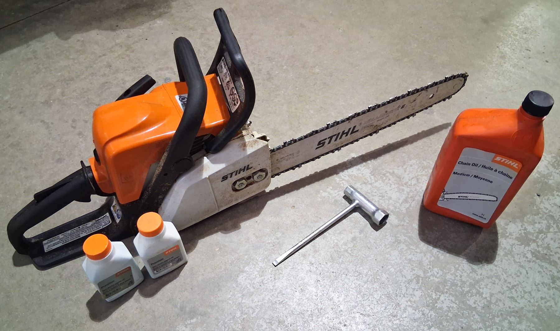 30.1CC ENGINE, ANTI VIBRATION SYSTEM. COMES WITH GLOVES, STIHL PREMIUM ENGINE OIL, AND CHAIN OIL.