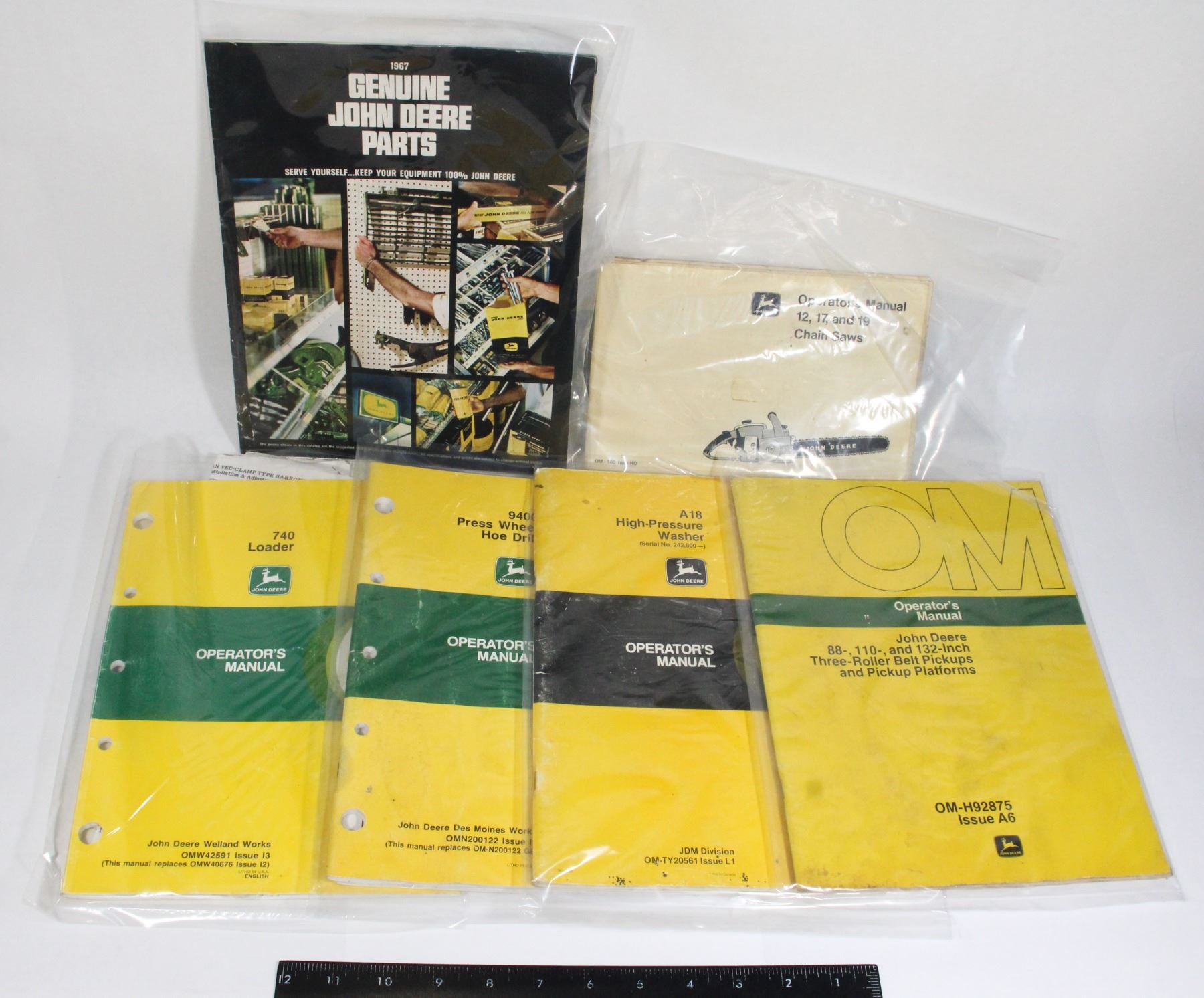 INCLUDES 1967 GENUINE JOHN DEERE PARTS MANUAL, OPERATOR'S MANUAL'S PICK UP PLATFORMS, HIGH-PRESSURE WASHER, PRESS WHEEL HOE DRILL, 740 LOADER AND CHAINSAW
