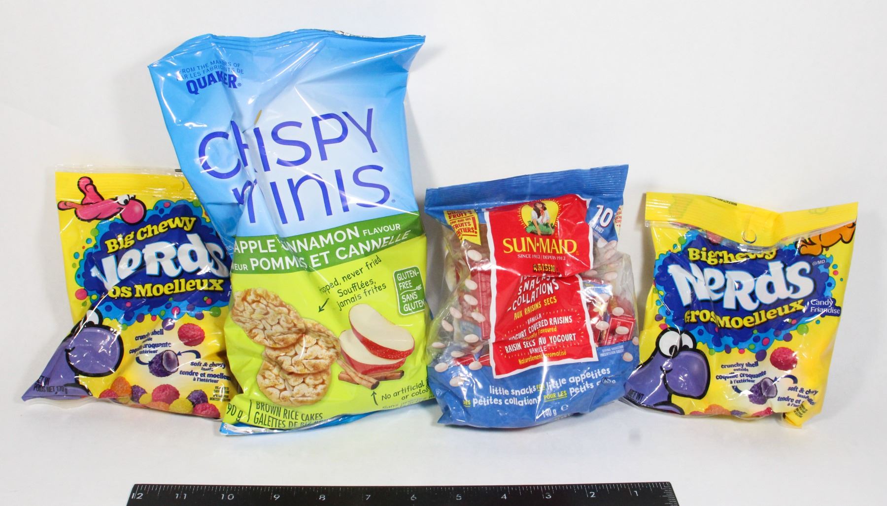 NERDS BIG CHEWY (2 X 170G) BEST BEFORE 2025 JL 11, SUNMAID YOGURT COVERED RAISINS (140G) BEST BEFORE 06 AUG 2025, CRISPY MINIS APPLE CINNAMON (90G) BEST BEFORE FE 22 2026