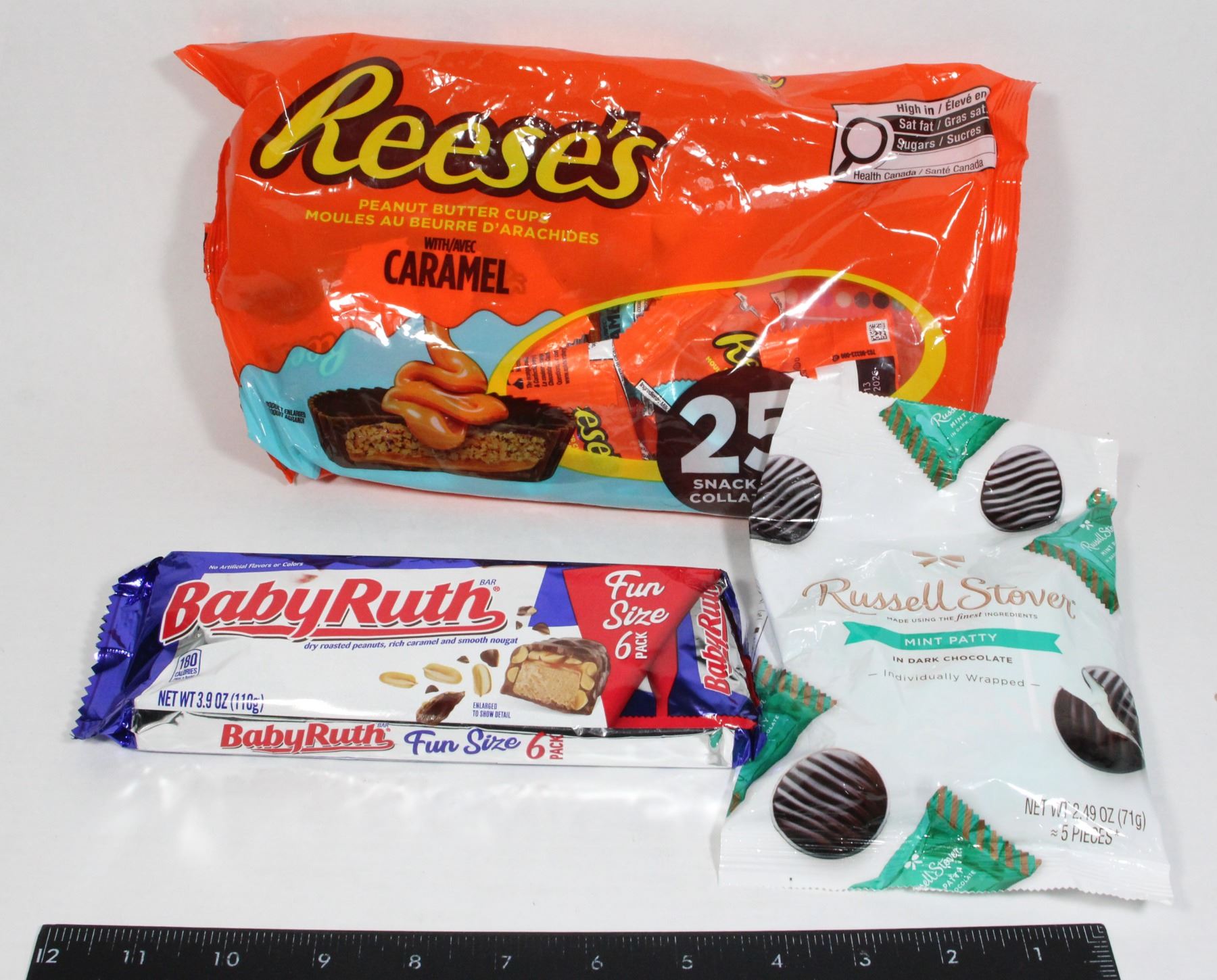 BABY RUTH BARS (110G) BEST BY: MAR 28 2025 REESE'S CARAMEL PEANUT BUTTER CUPS (389G) BEST BY: 01 2026 RUSSELL STOVER MINT PATTY IN DARK CHOCOLATE (71G) BEST BY: 01 NOV 2024