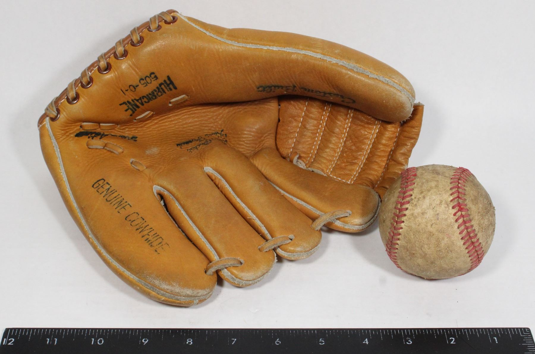 Lot 1438 VINTAGE HURRICANE BASEBALL GLOVE & BASEBALL
