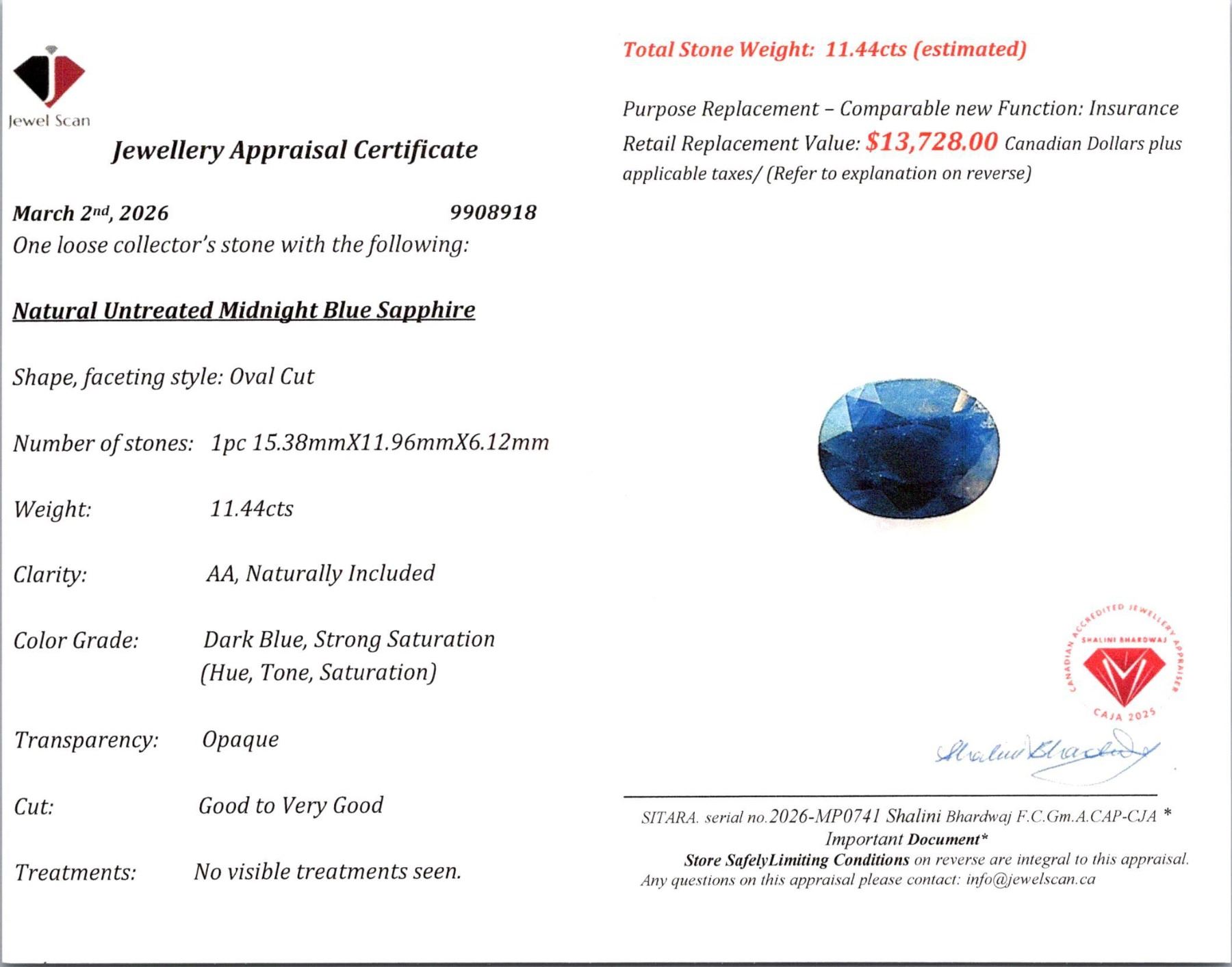 Lot 4047 *^11.44 ct Certified Midnight Blue Sapphire gemstone Untreated ($13,728 Appraisal)