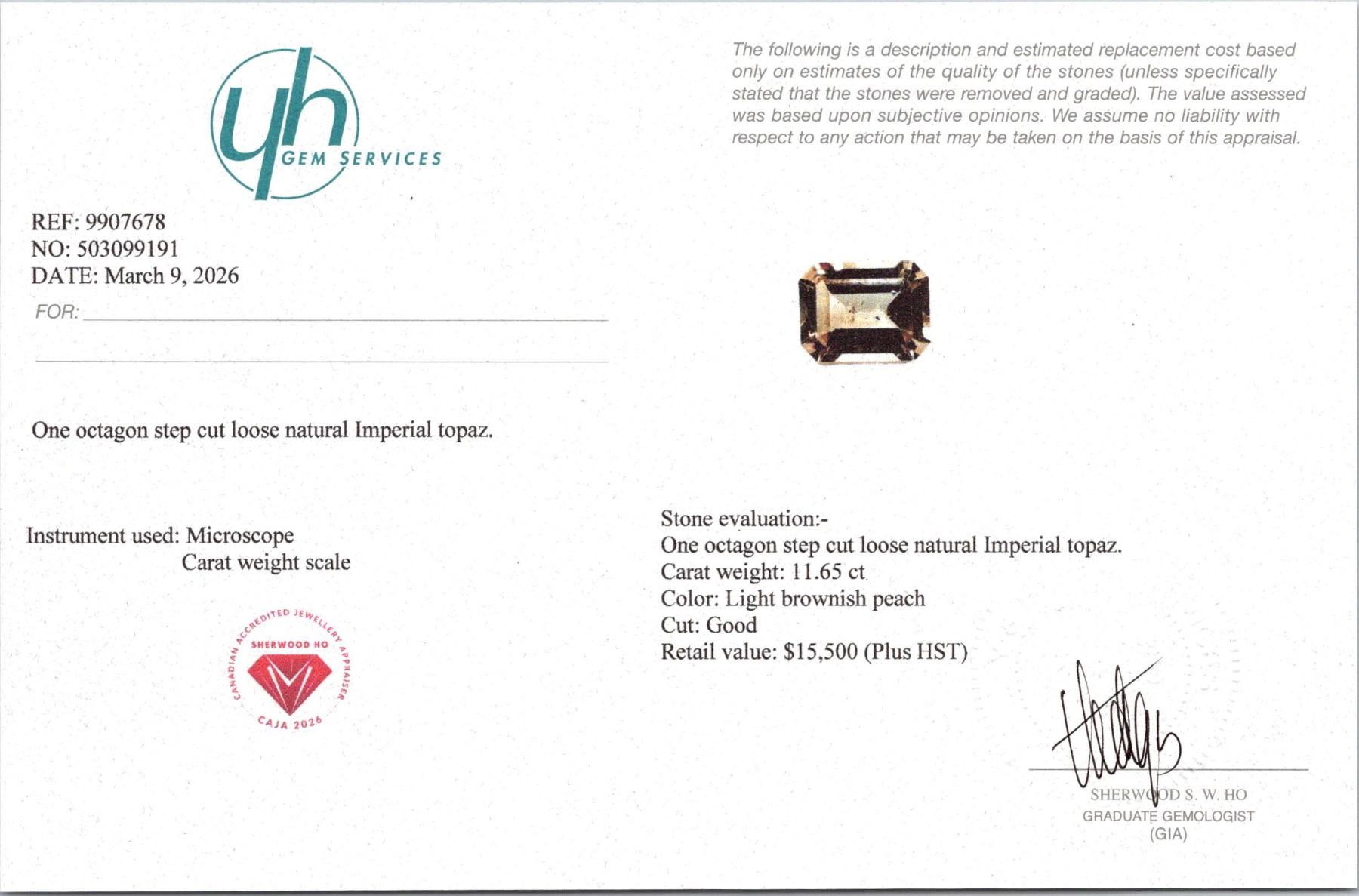 Lot 4050 *^11.65 ct Certified Imperial Topaz gemstone Untreated ($15,500 Appraisal)