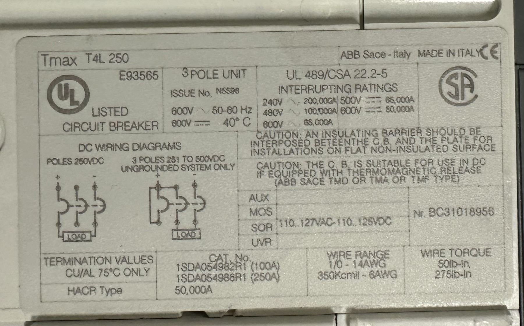 Lot 65 Lot of (3) ABB #Tmax T4L 250 Circuit Breaker & 2 - Shut Off Handles