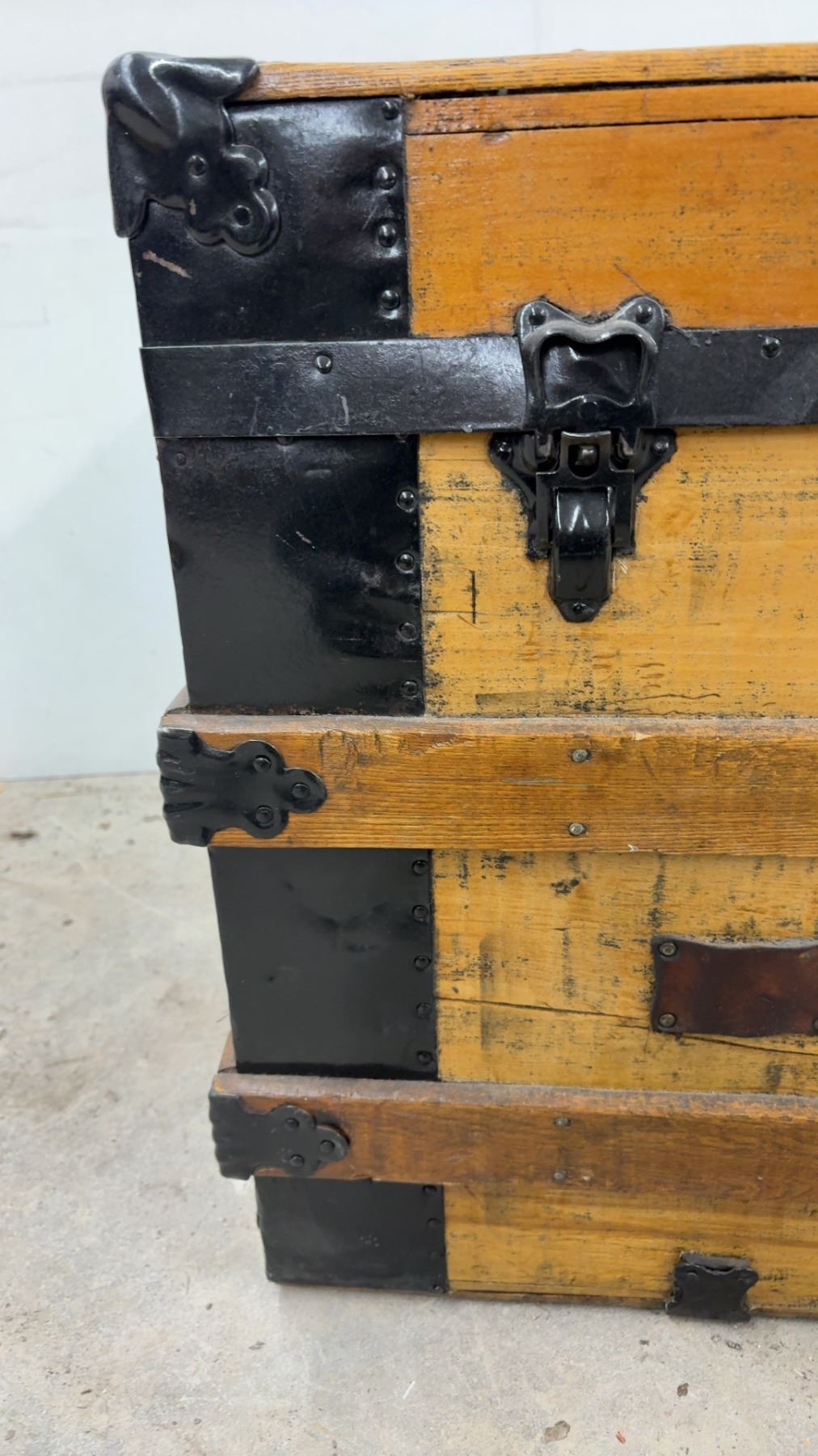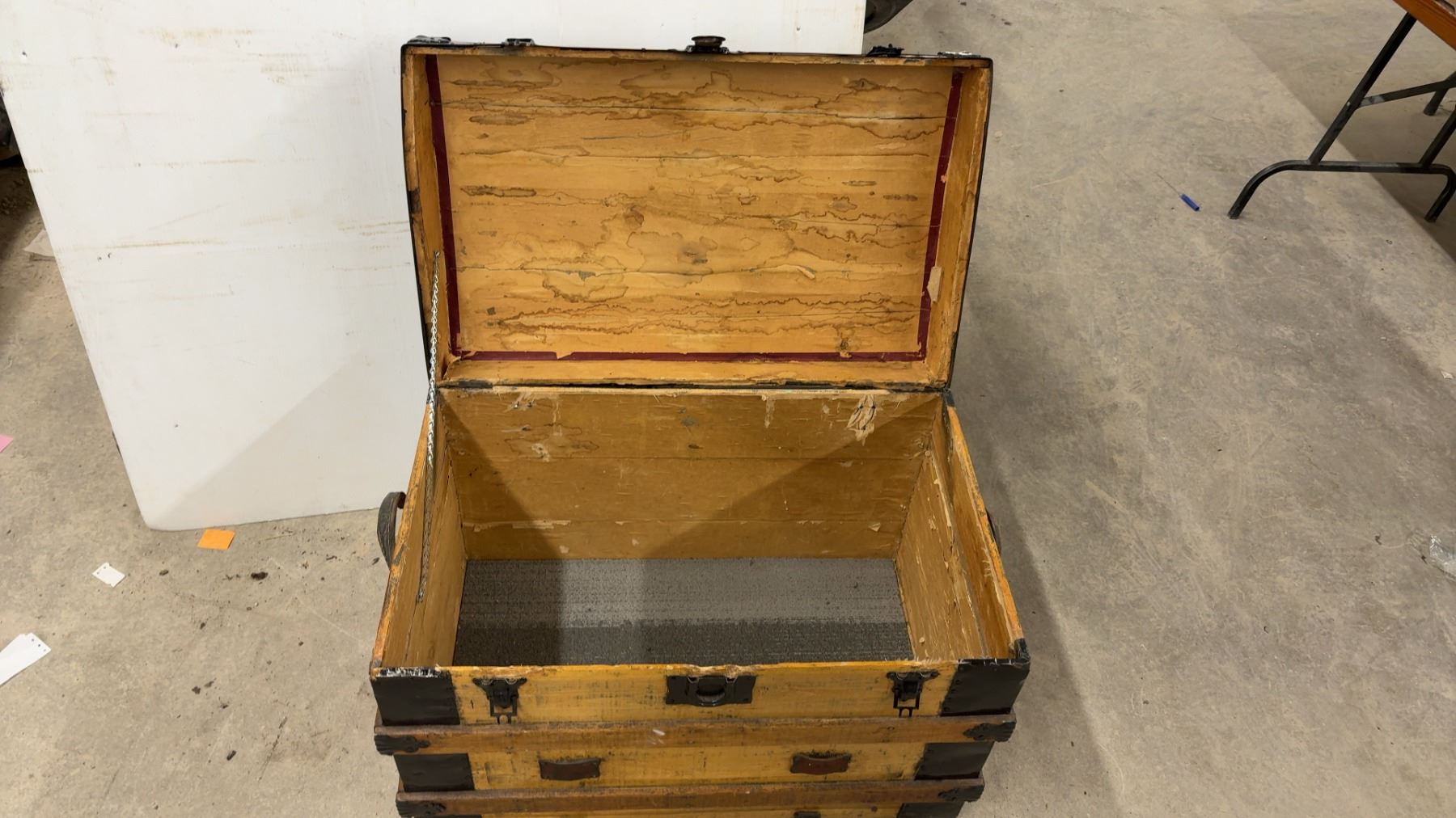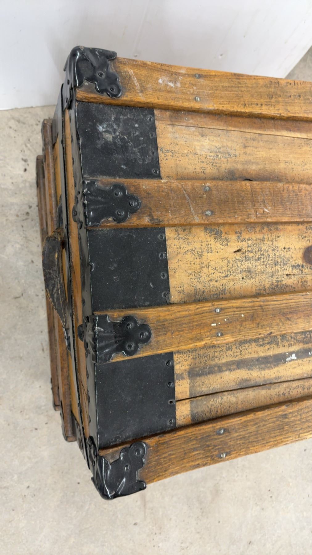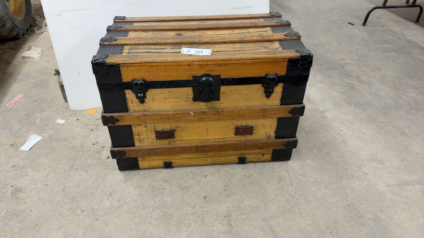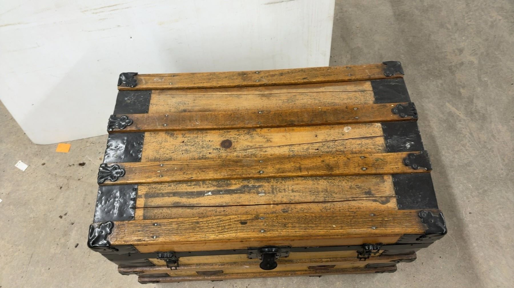 Lot 889 Antique Wooden Steamer Trunk w/ Black Metal Hardware and Latches, 21-1/2x30-1/2x20"
