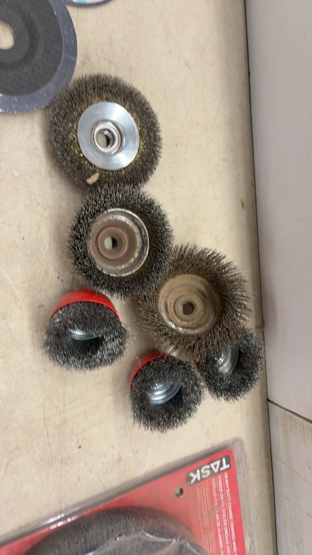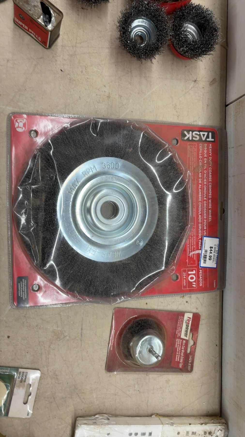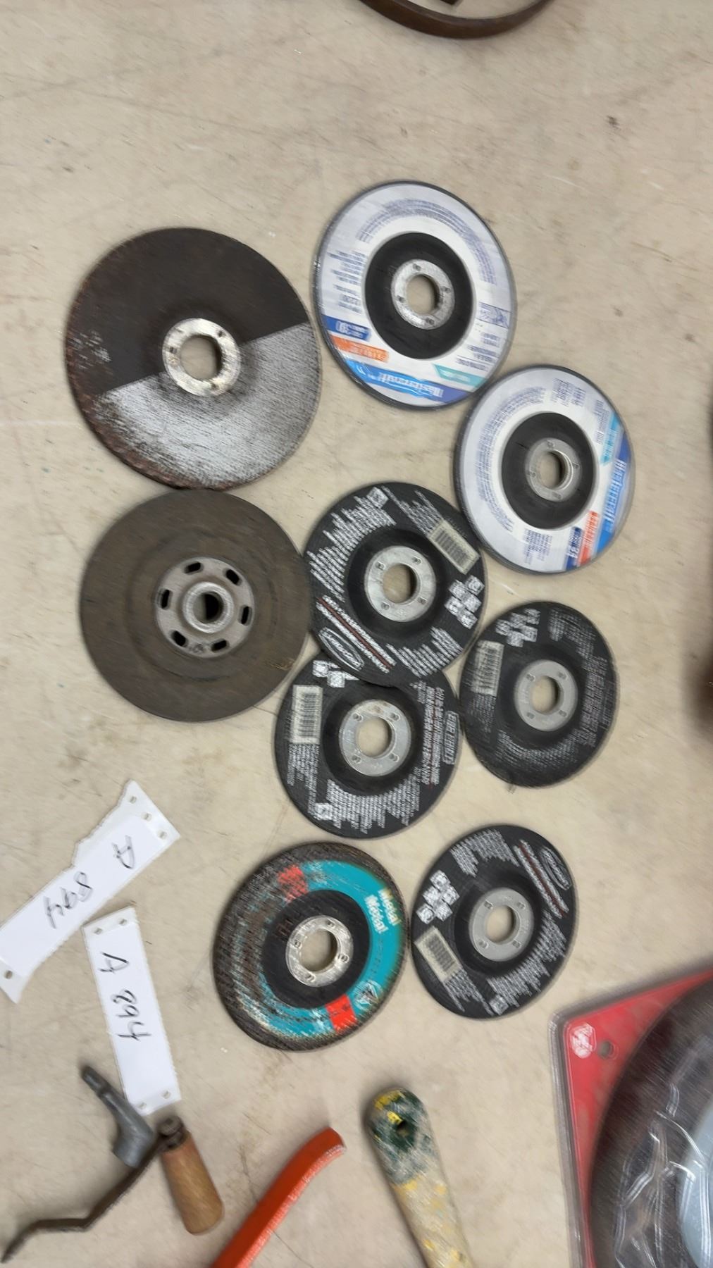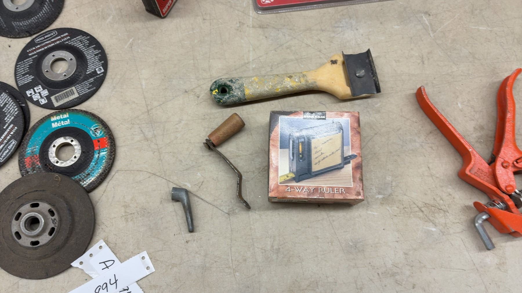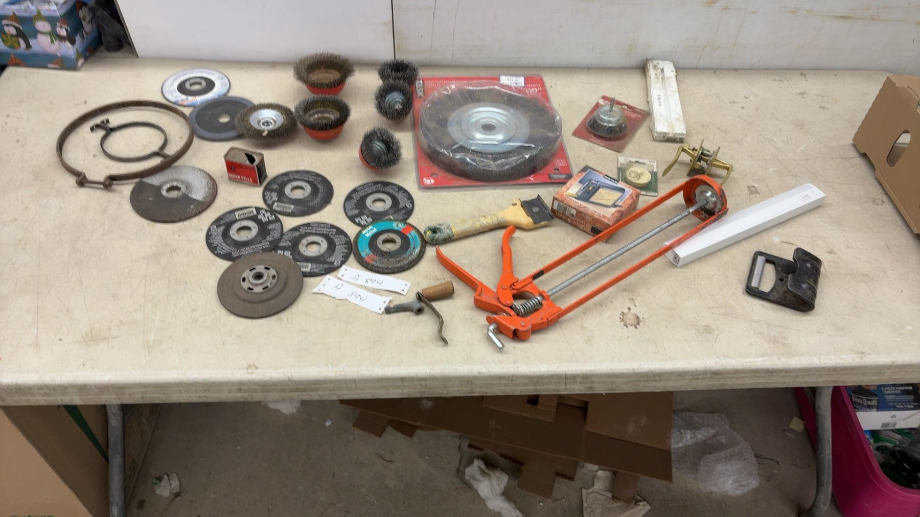 Lot 894 Assorted Grinding Wheels, Wire Brush Cups, Scraper, Door Hardware, Caulking Gun and More