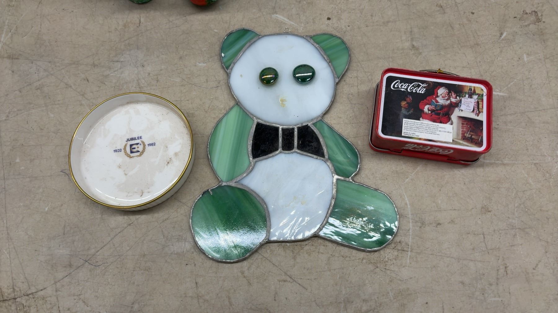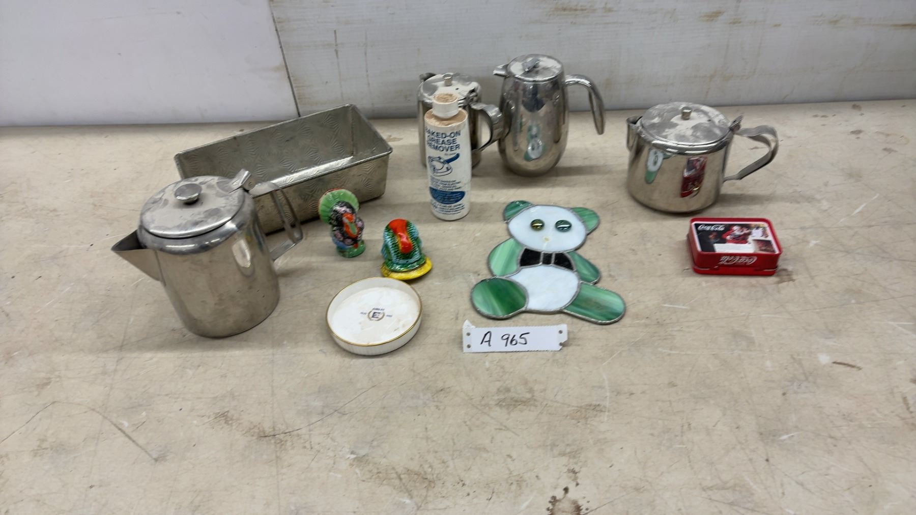 Lot 965 Stainless Steel Coffee Pots, Loaf Pan, Stained Glass Panda, Coca-Cola Tin, Salt and Pepper