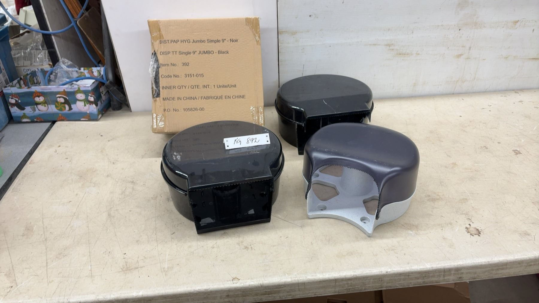 Lot 892 4 Jumbo 9" Toilet Paper Dispensers, Black and Gray – 1 NIB, 1 No Key, 1 Cracked Face