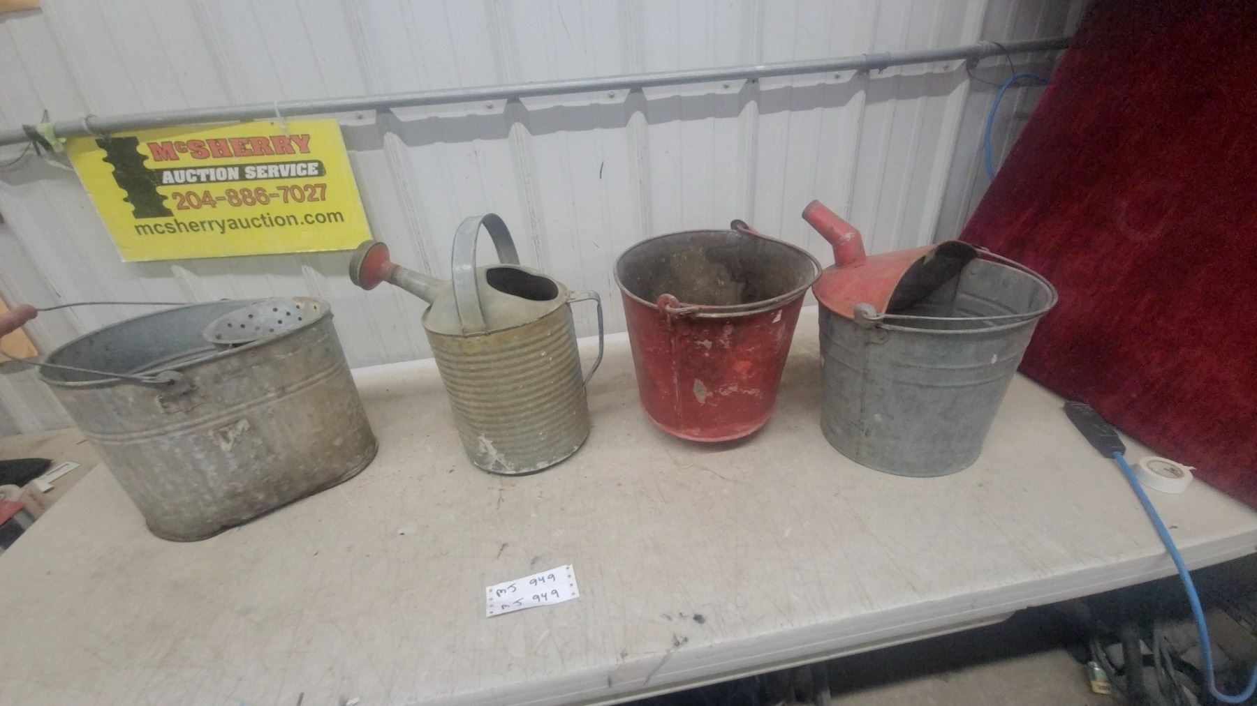 Lot 949 Galvanized Buckets, Watering Can, and Red Fireman Bucket Lot