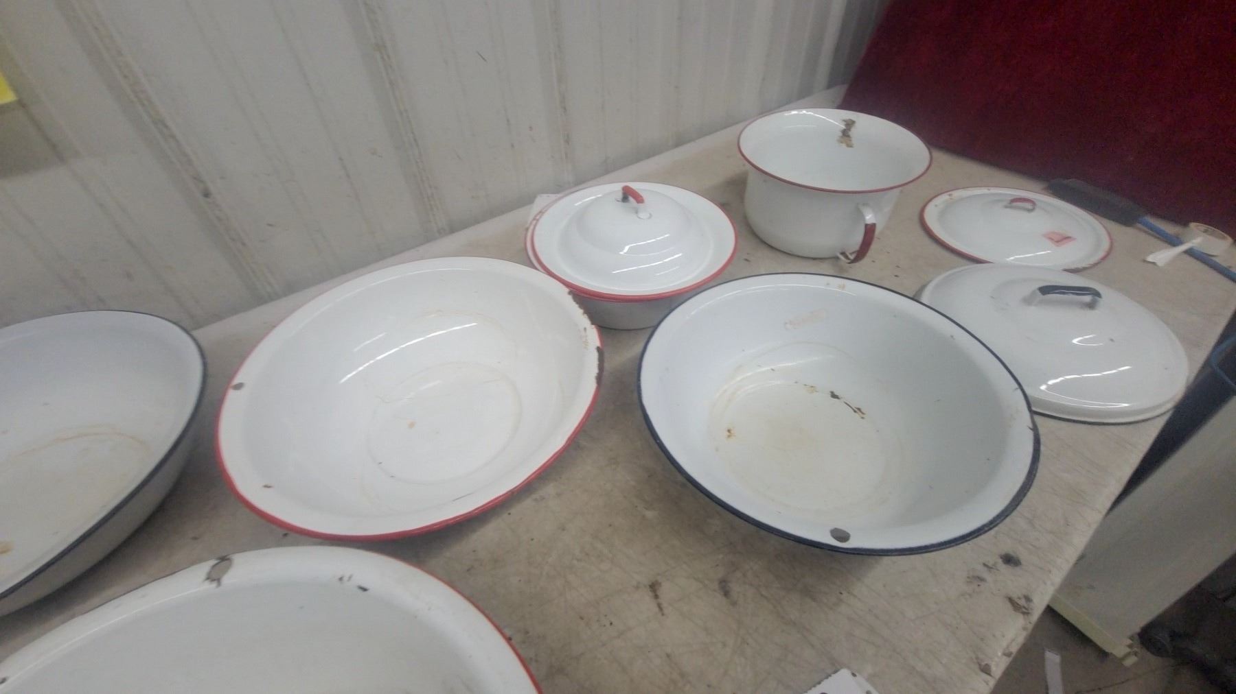 Lot 1037 8-Piece Vintage White Enamelware Collection w/ Red/Blue Trim – Basins, Bowls, Pot