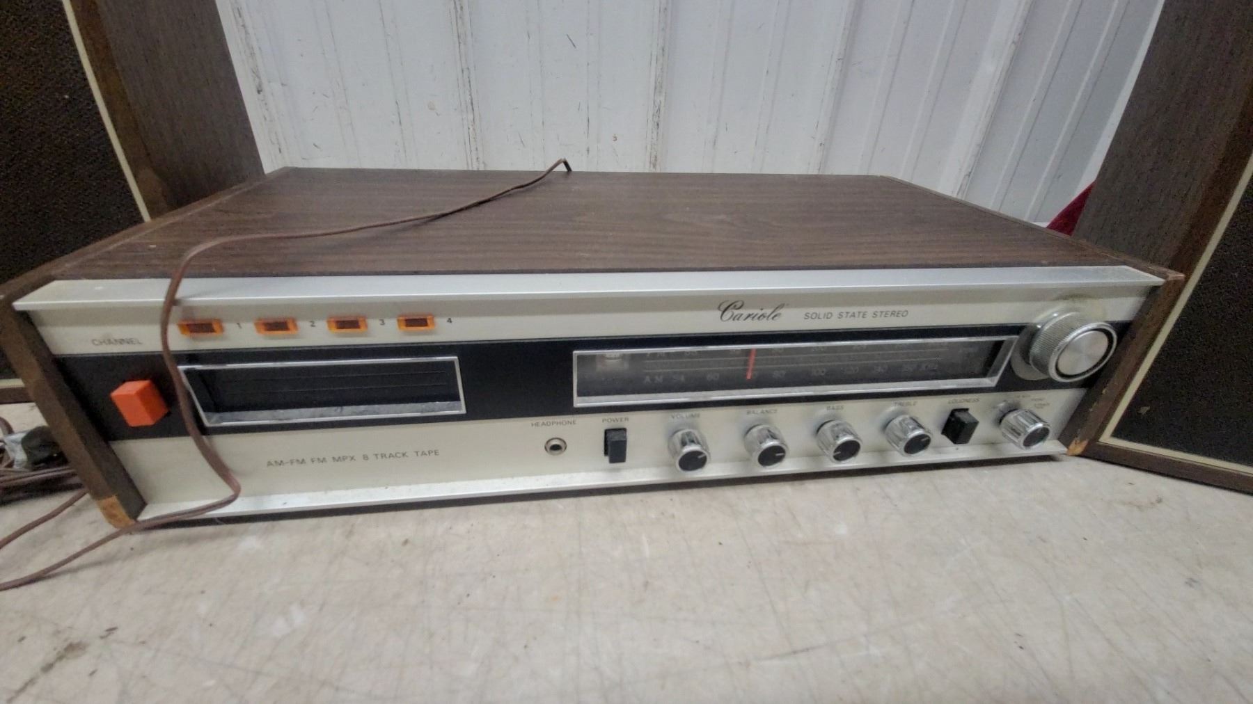 Lot 1048 Vintage Cariole AM/FM/8-Track Stereo Receiver w/ Pair of Matching Speakers, Wood Cabinet