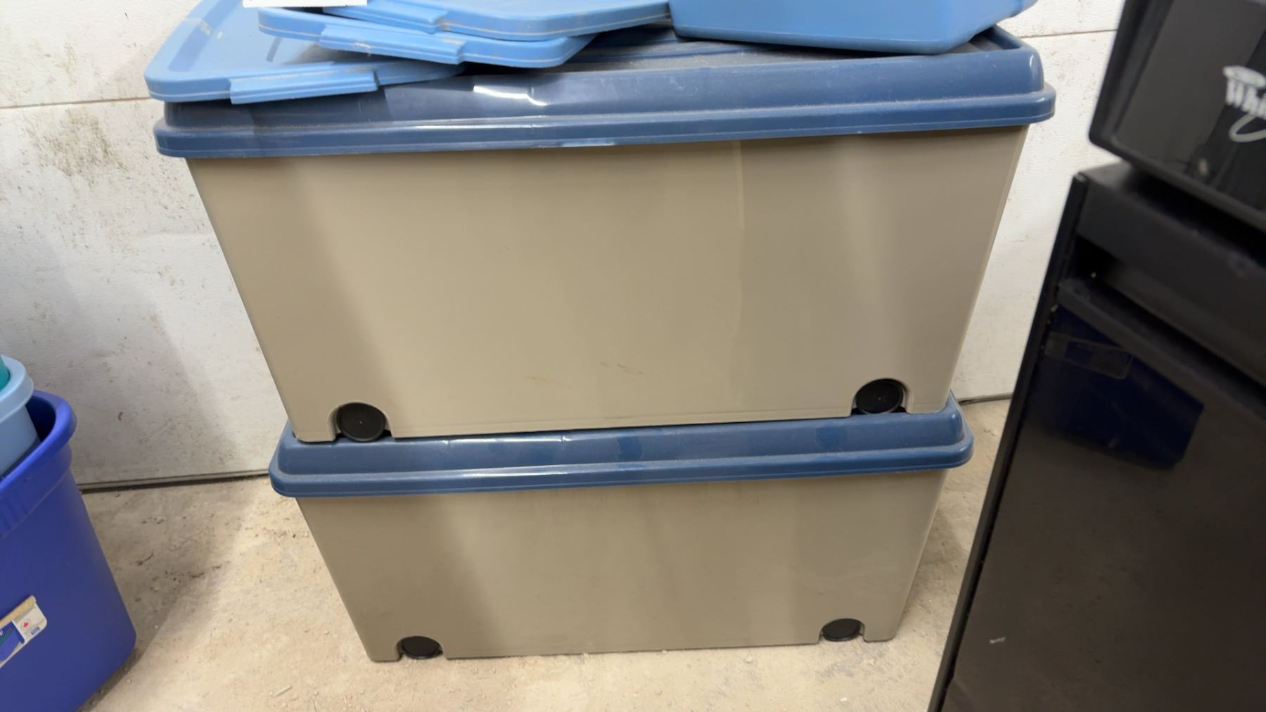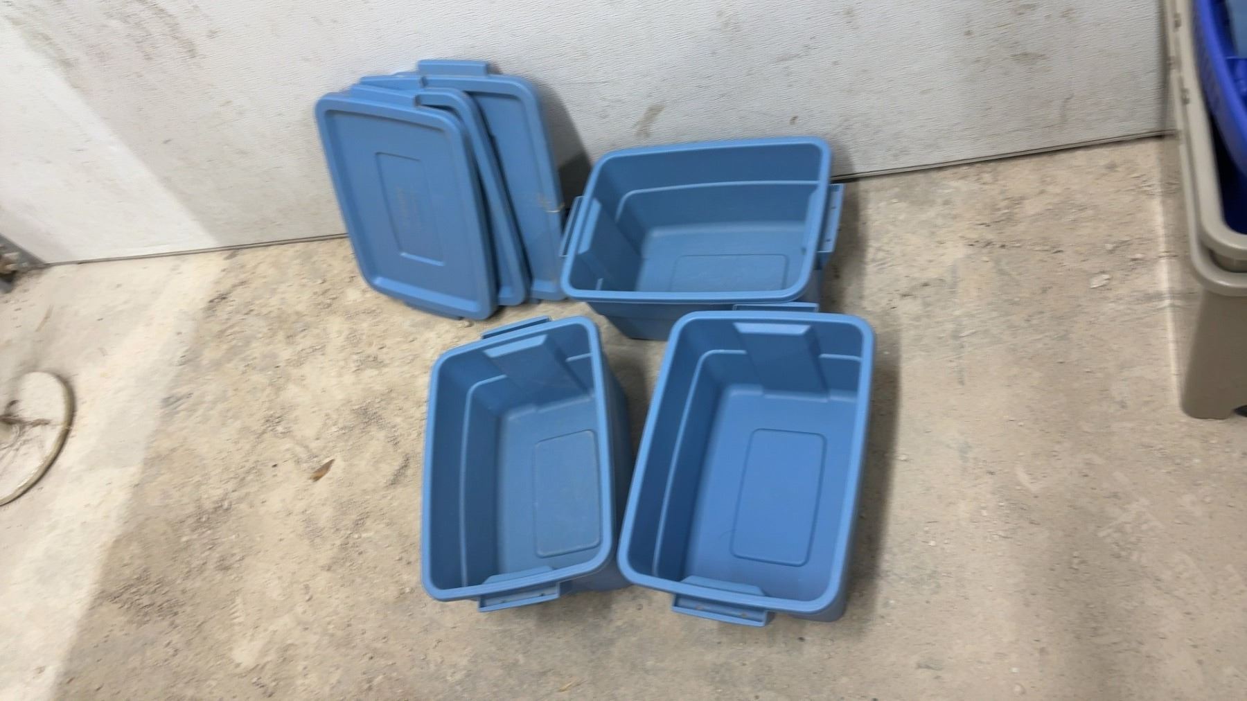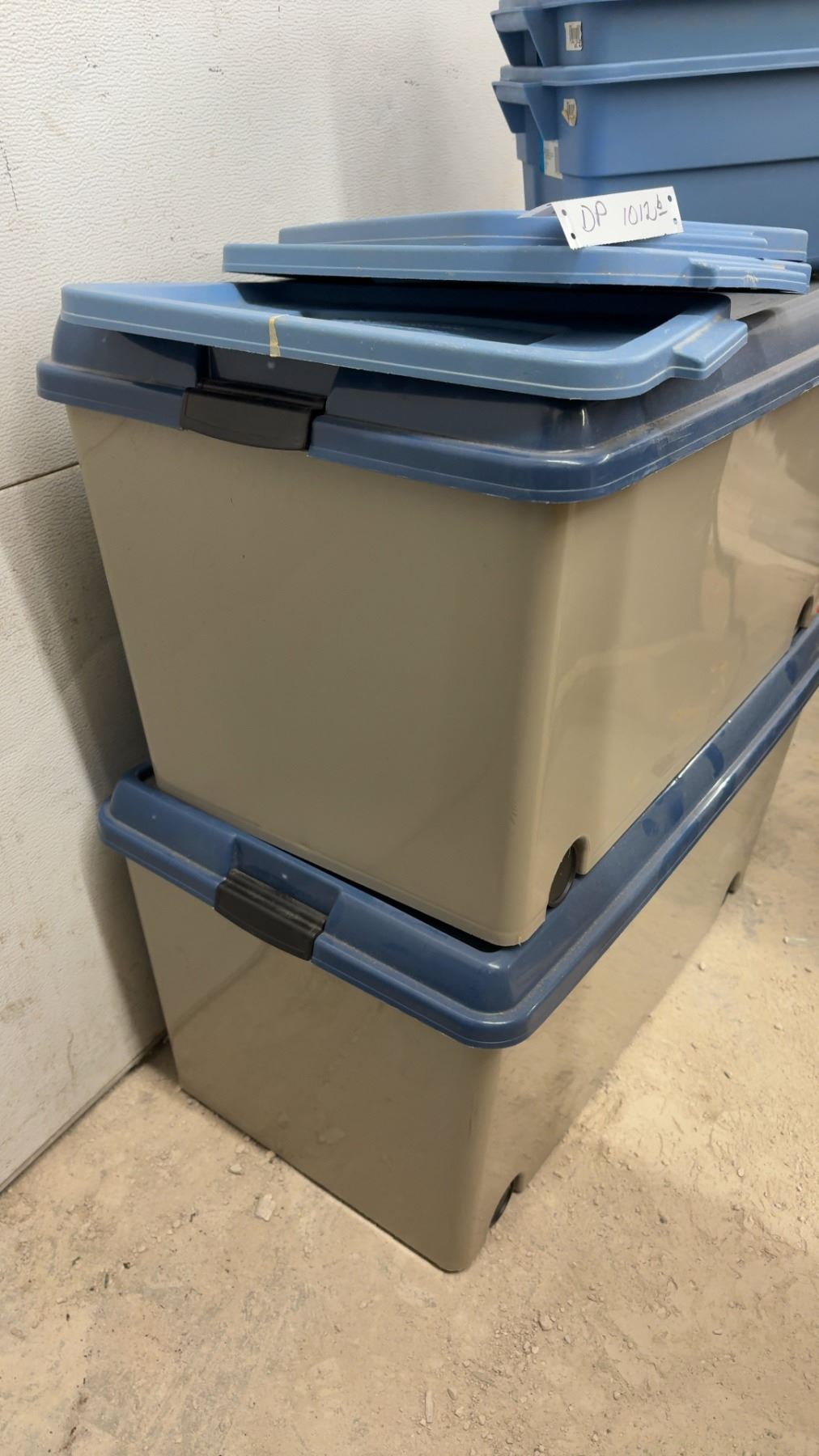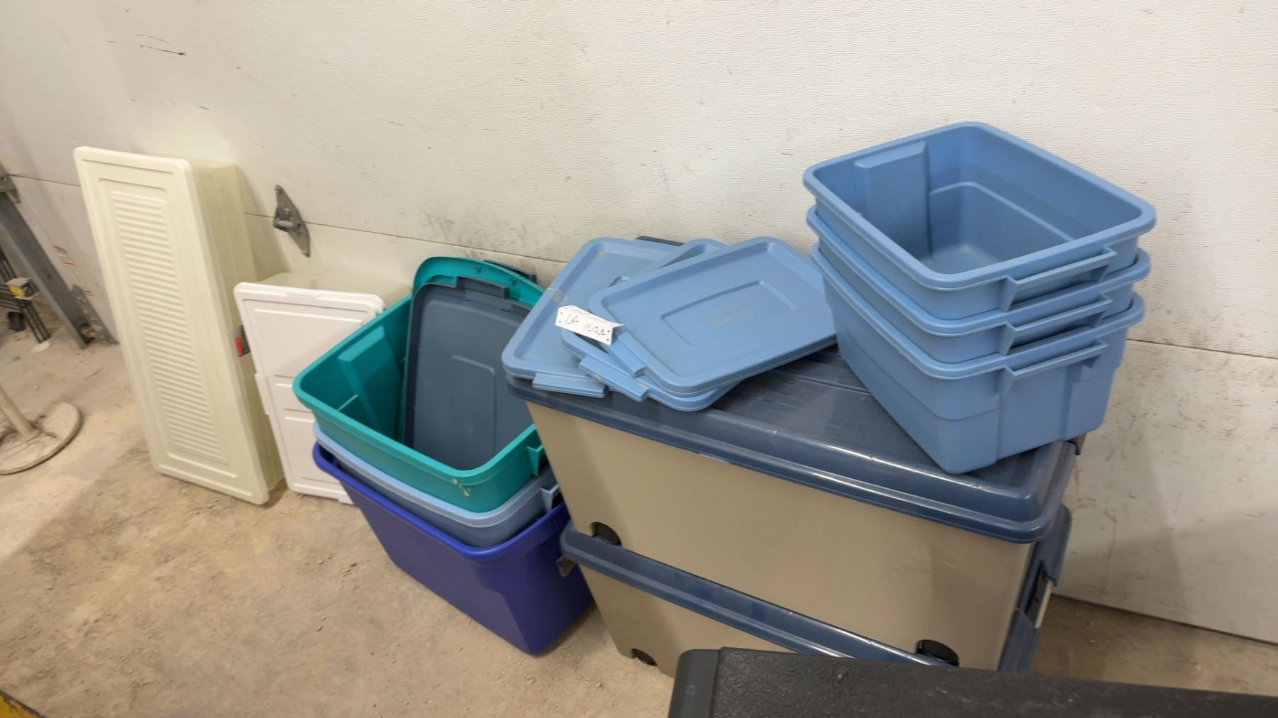 Lot 1012B 10 Assorted Plastic Storage Totes w/ Lids, Various Sizes and Colors