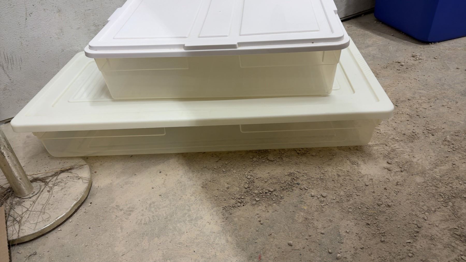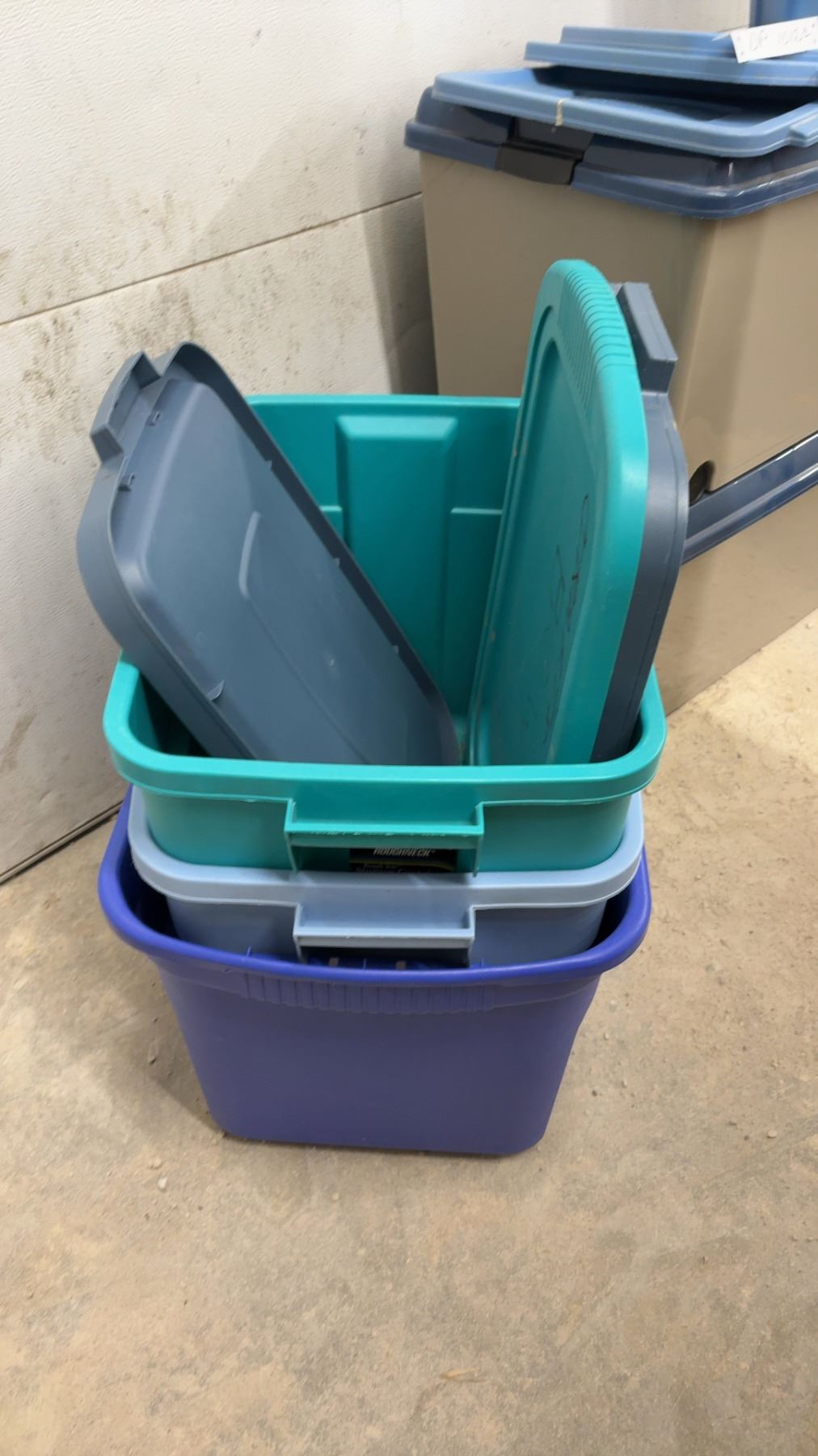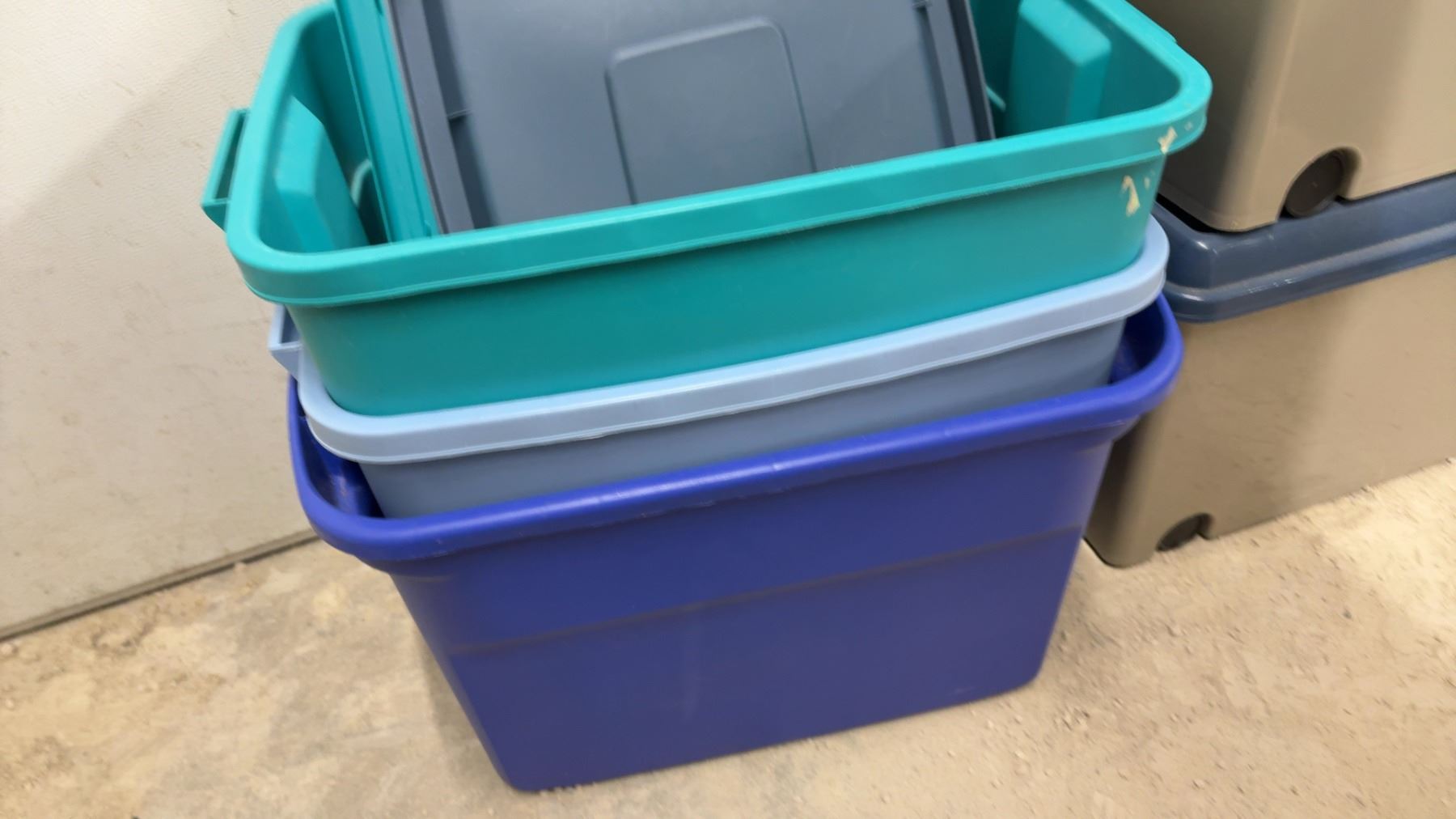 10 Assorted Plastic Storage Totes w/ Lids, Various Sizes and Colors