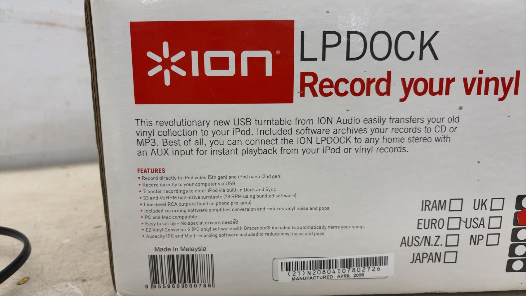 Lot 1024 ION LPDOCK USB Turntable w/ iPod Dock, Original Box, Software CD and Manual