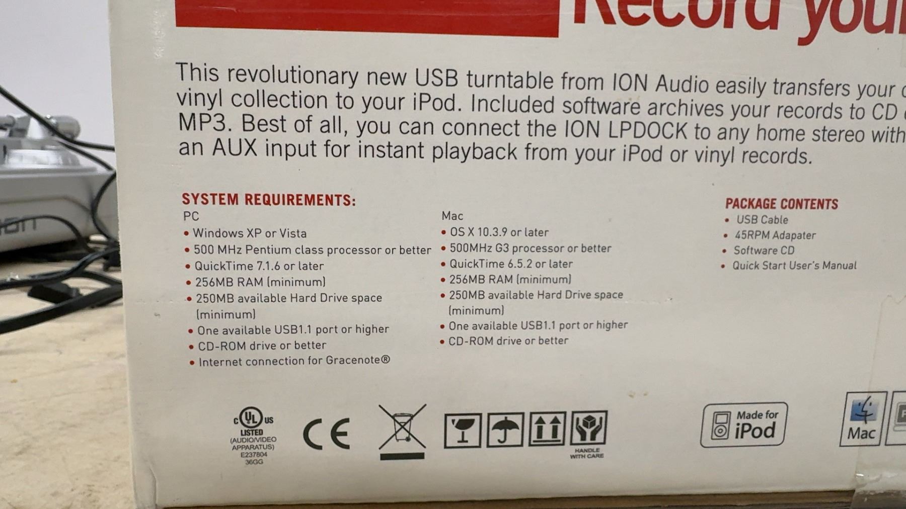 ION LPDOCK USB Turntable w/ iPod Dock, Original Box, Software CD and Manual